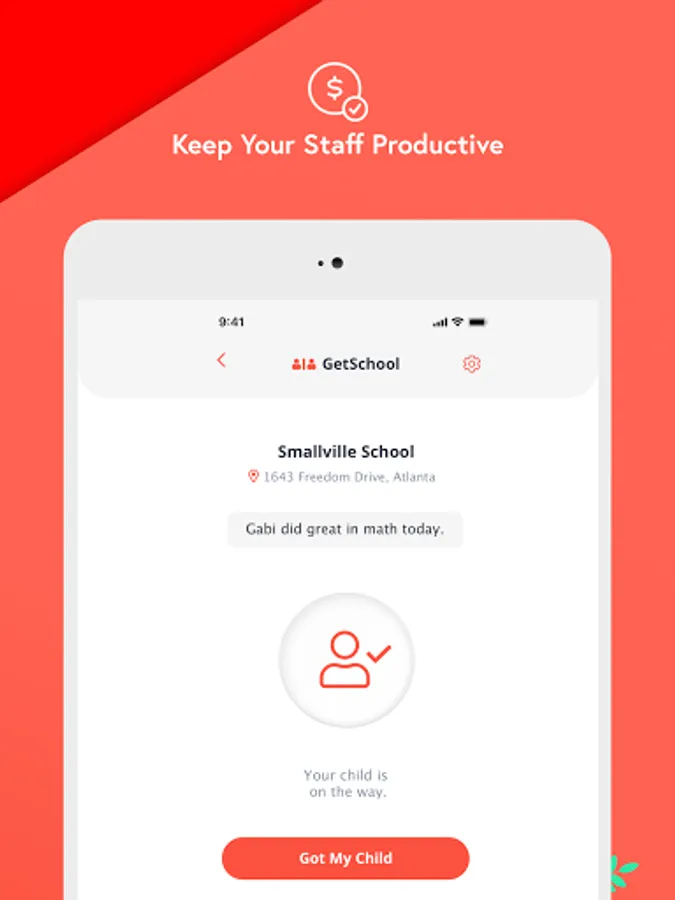 • Secure and Efficient -- Phone calls, notes, or P.A. announcements waste admin time, and expose student information. GetSchool encrypts data and ensures kids are released to approved caregivers.