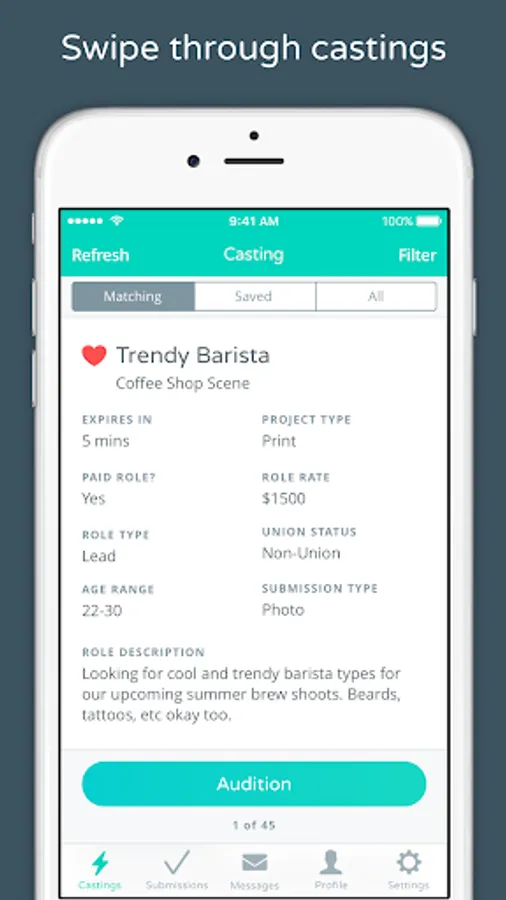 SWIPE - Swipe through roles that match you. Either submit on the spot or save the audition for later.