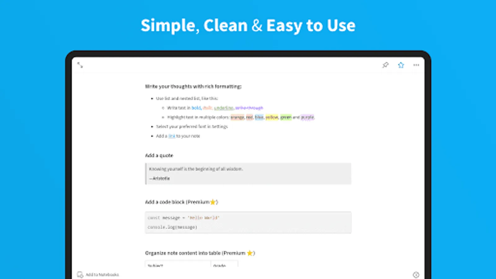 UpNote offers highlight, text colors, table, nested list, code and many other important formatting tools so that you could easily format your notes.