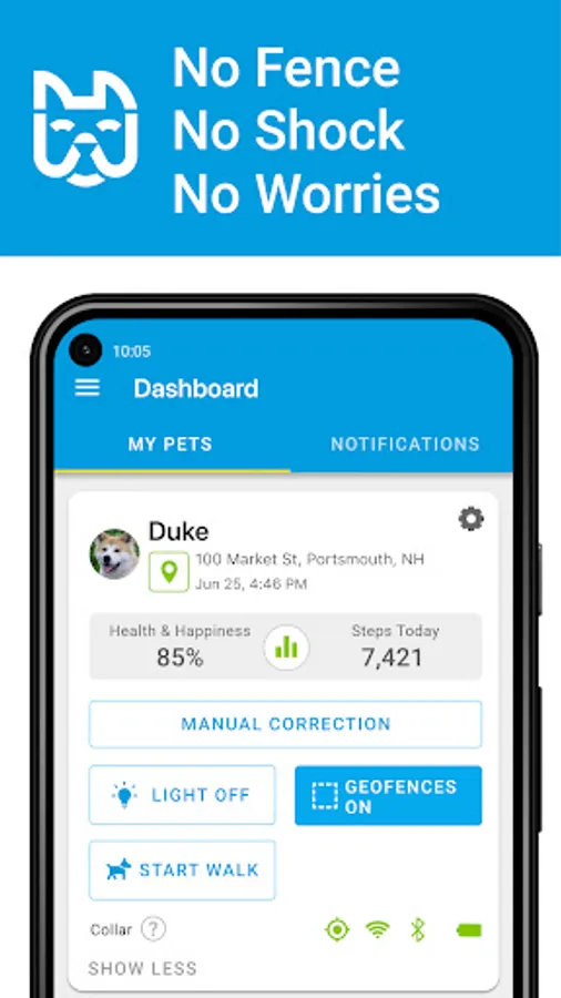To keep your dog contained inside a geofence, the Freedom Collar features three types of humane, shock-free corrections: audible sound, ultrasonic sound and vibration. Use one, two or all three without fear of harming him. Corrections occur automatically when he approaches a geofence. You can also manually send a correction in the Wagz App to help discourage bad habits such as continuous barking, jumping, etc.