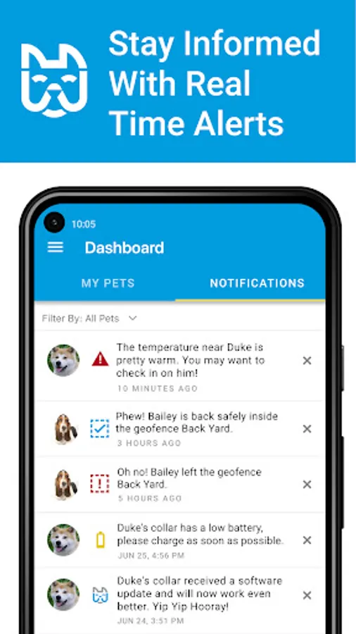 Ambient Temperature Alerts: Notifies you when it may be too hot or too cold for your dog.
