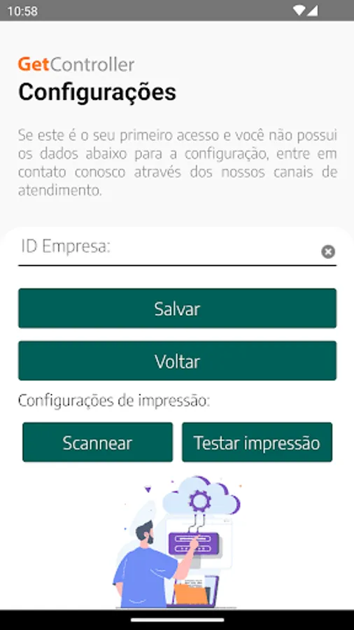 For the application to work, it is necessary to make a pre-configuration by clicking on the Settings button and informing the data for access.