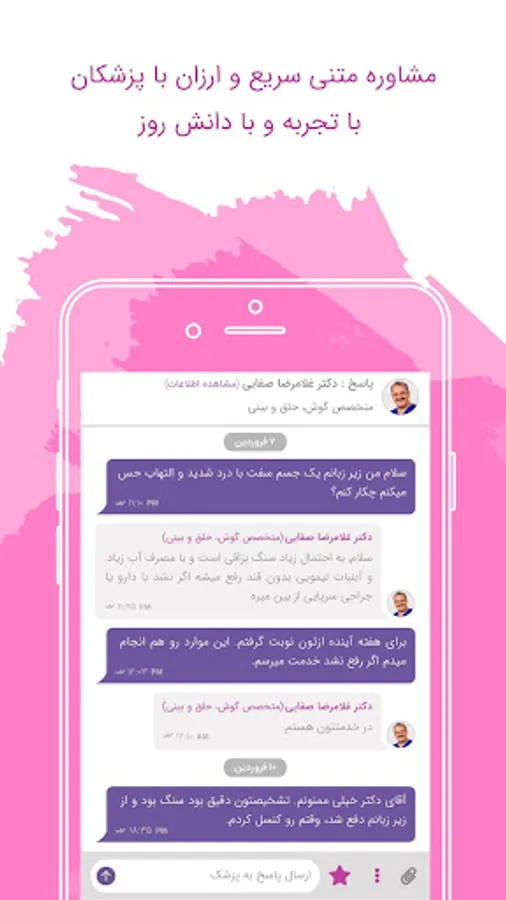 Text consultation: Any user can receive free questions by referring his friends, for the rest of the consultations, 30000 Tomans.