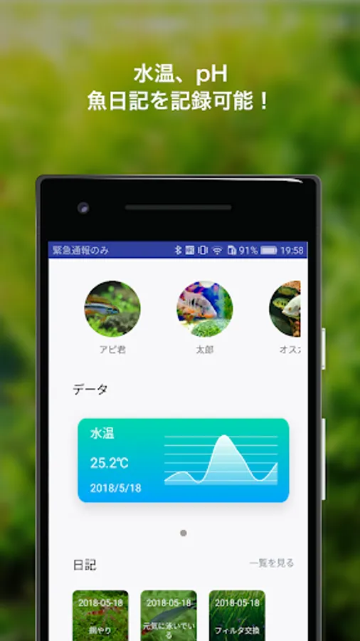 アクアリウムの本格管理のため、水温やpHを記録することができます。