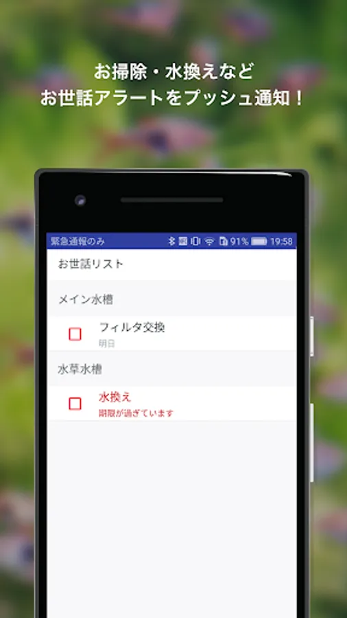 アクアリウムはたくさんお世話しなければいけないことが多く、管理が大変ですが、このアプリにはそんな忘れがちなお世話を登録することが出来ます。