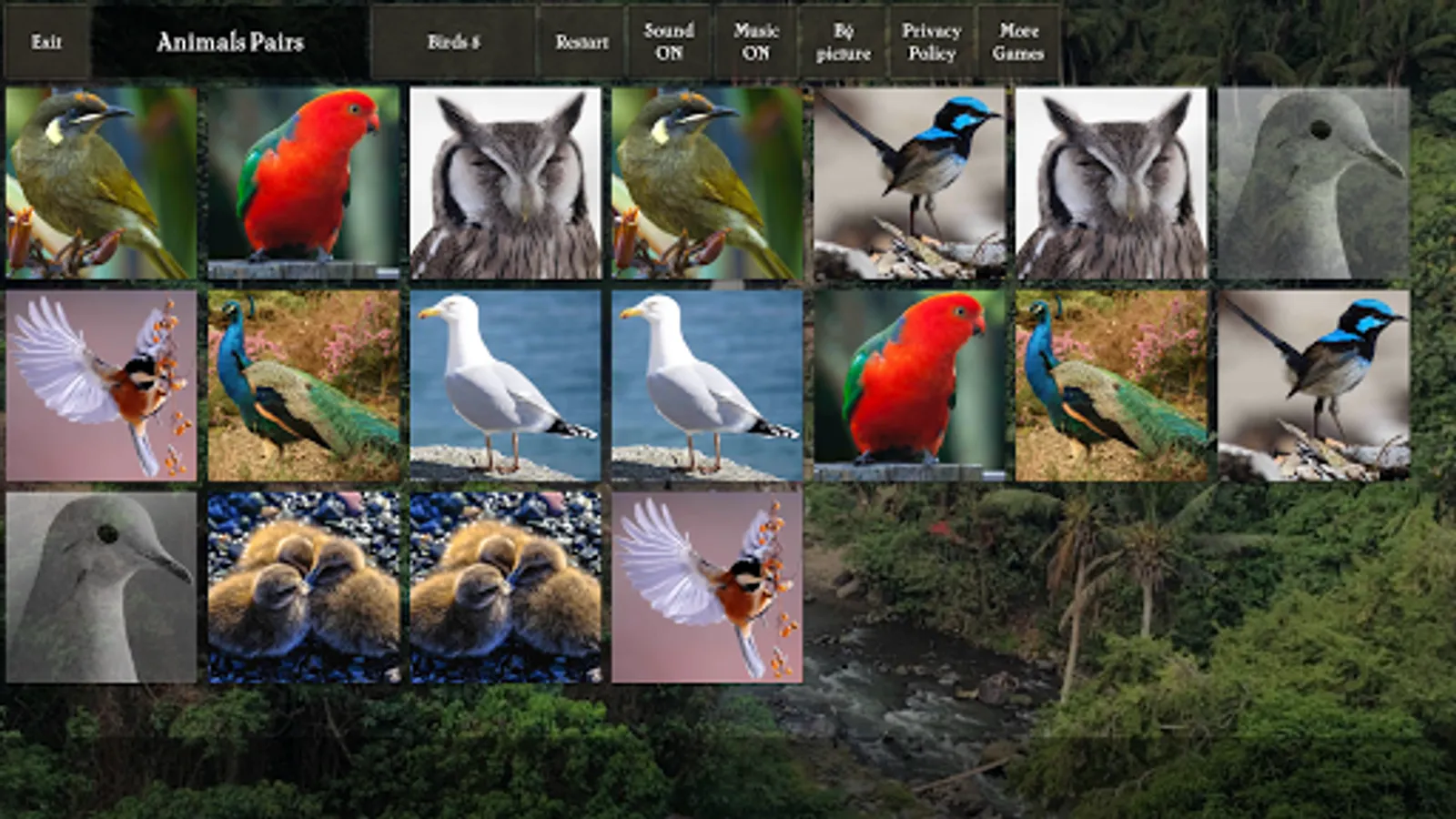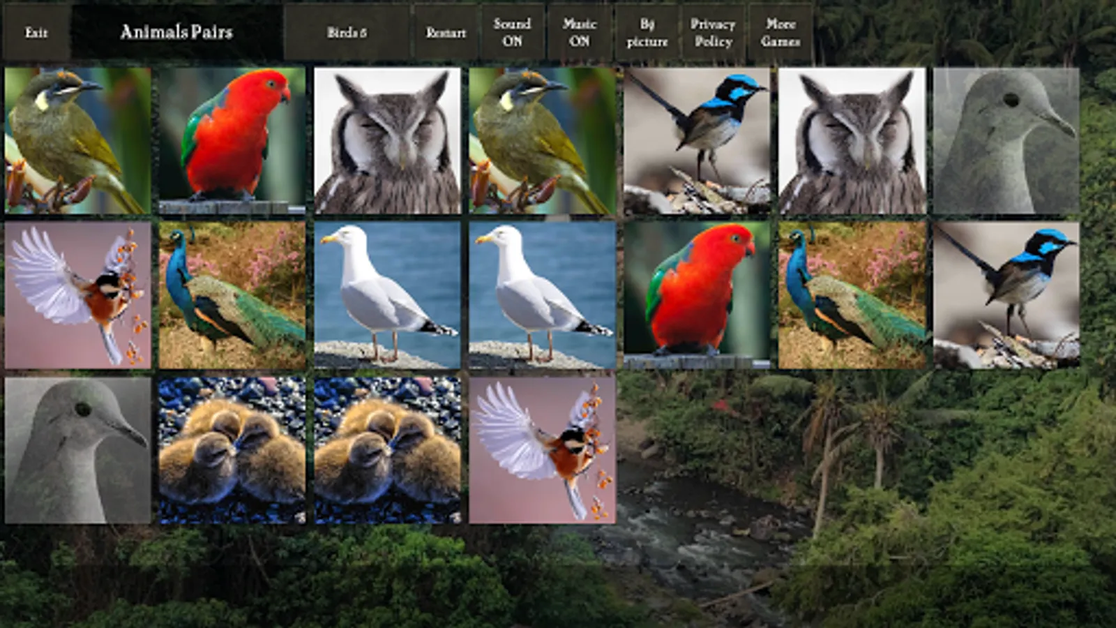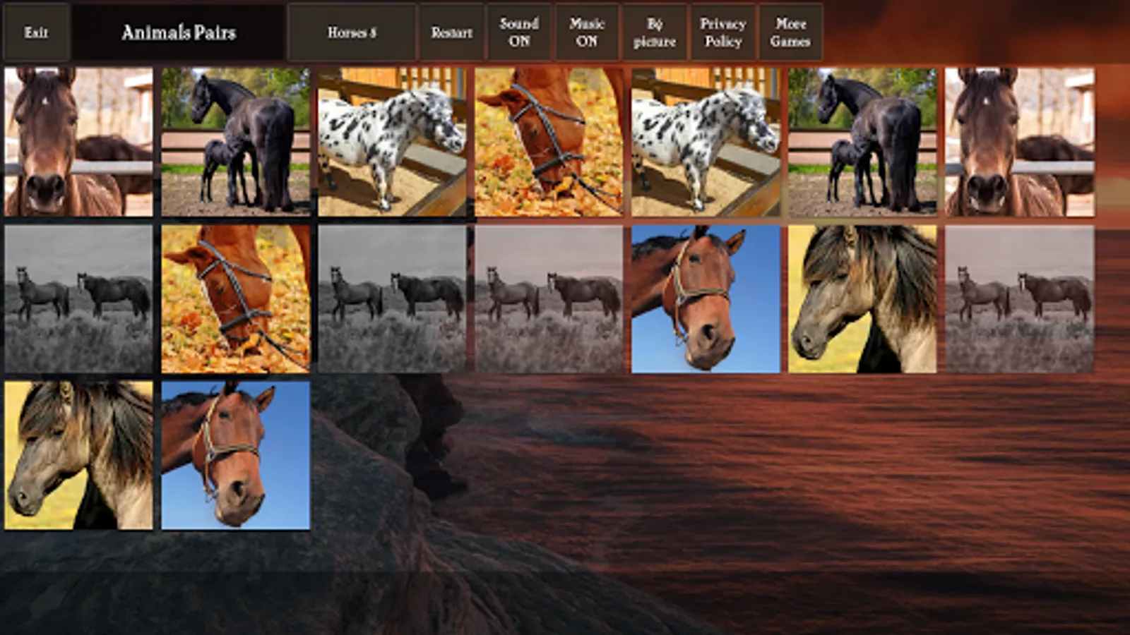 Pairs (pexeso, concentration) game where you match photos of animals: cats, dogs, horses, birds. The game is great for training your visual memory and keeping your brain sharp.