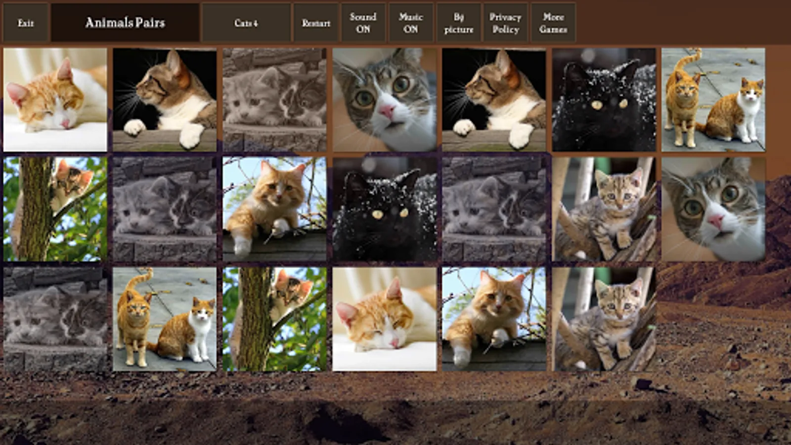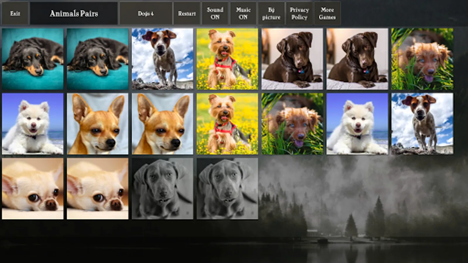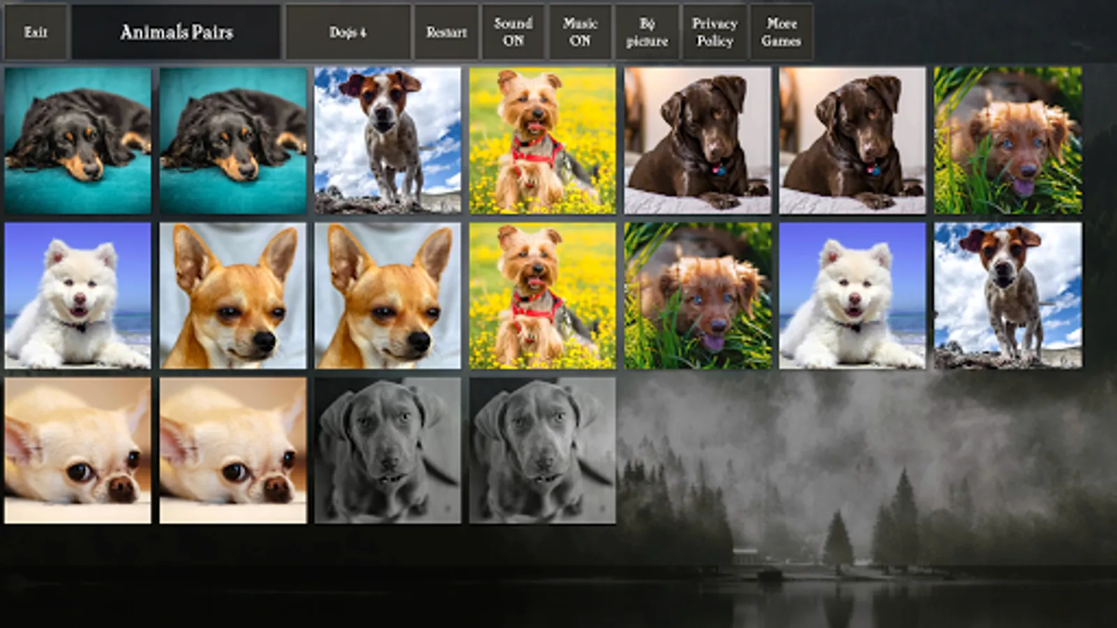 Pairs (pexeso, concentration) game where you match photos of animals: cats, dogs, horses, birds. The game is great for training your visual memory and keeping your brain sharp.