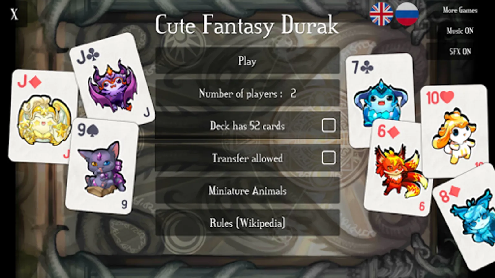 Card game Durak (Fool) with cute fantasy creatures on the cards. You can play against 1-5 AI opponents.