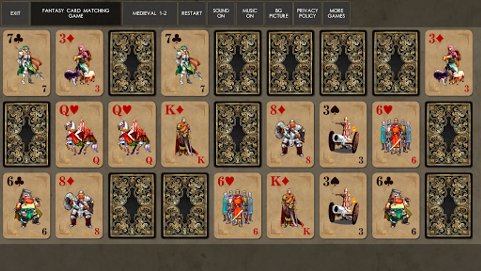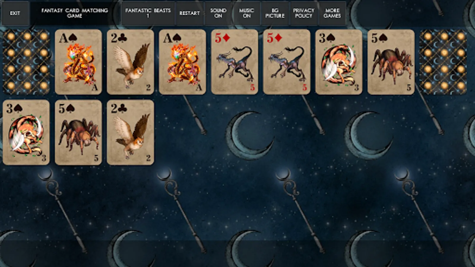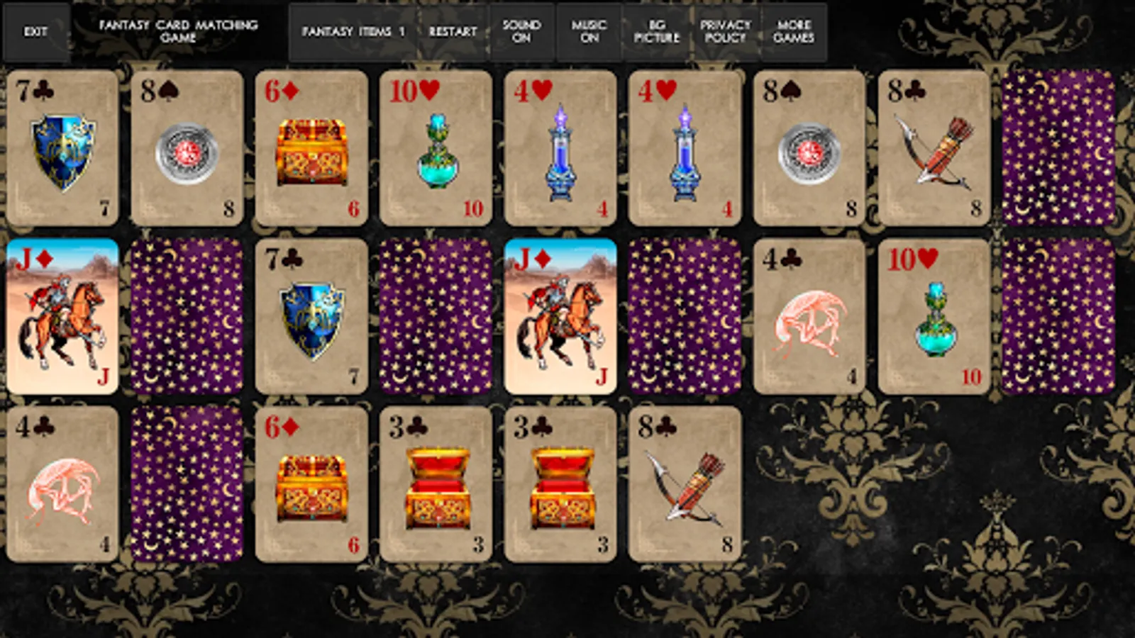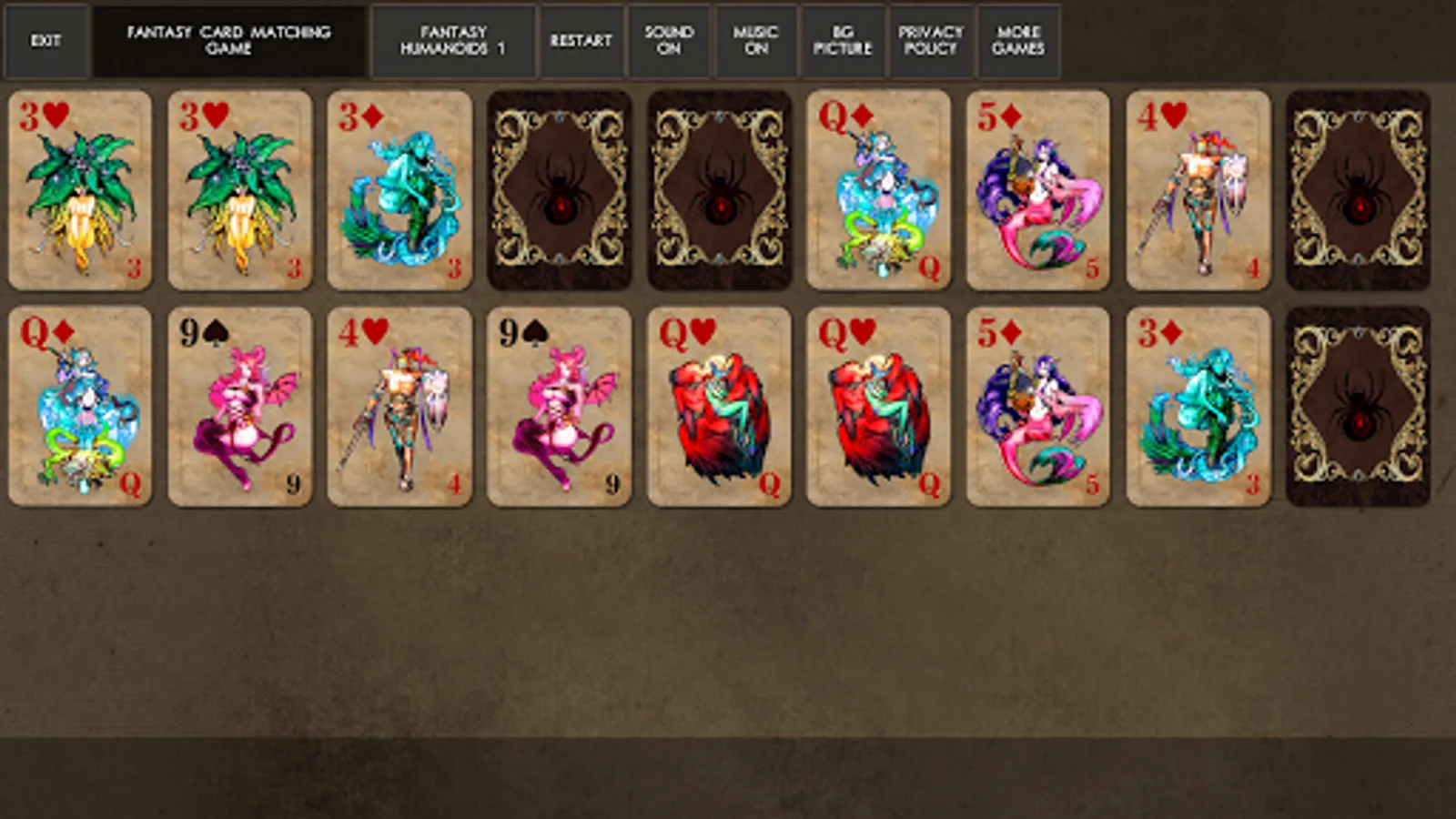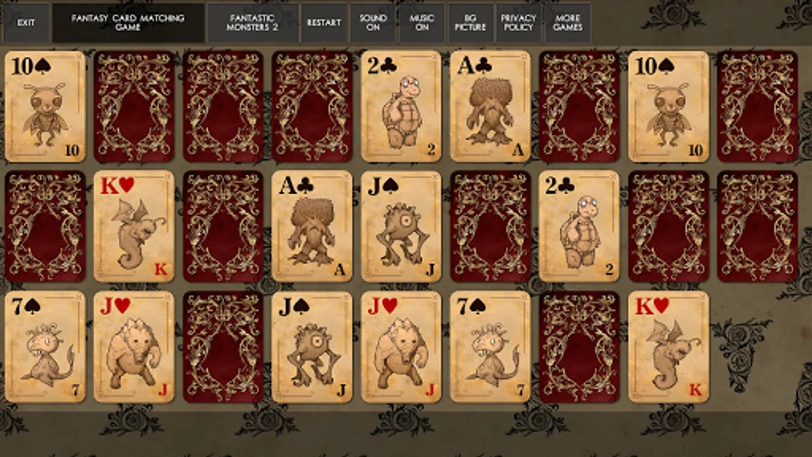 In this game you need to match pairs of cards with fantasy creatures on them. Open all cards on the board to win.