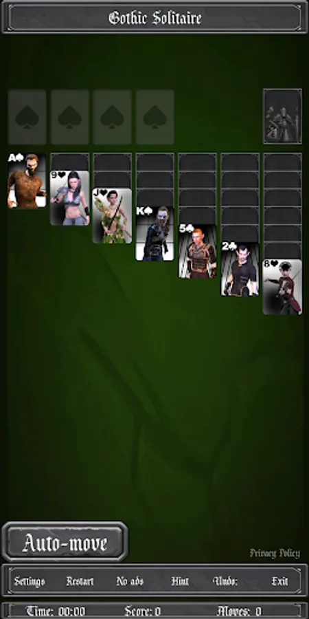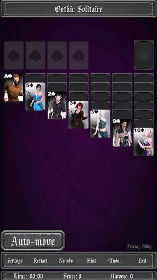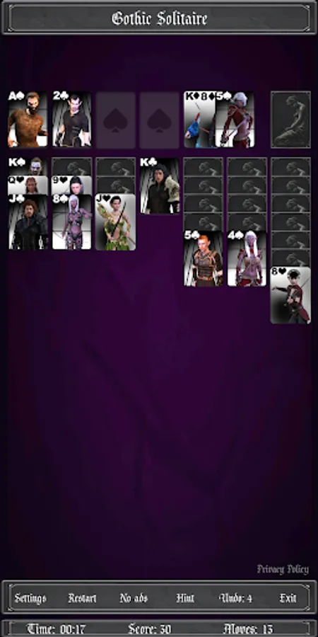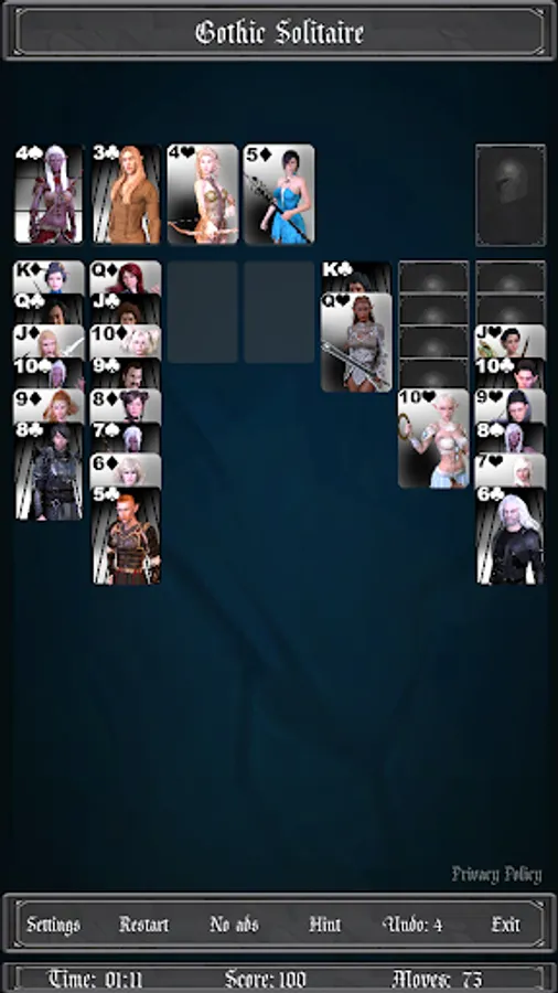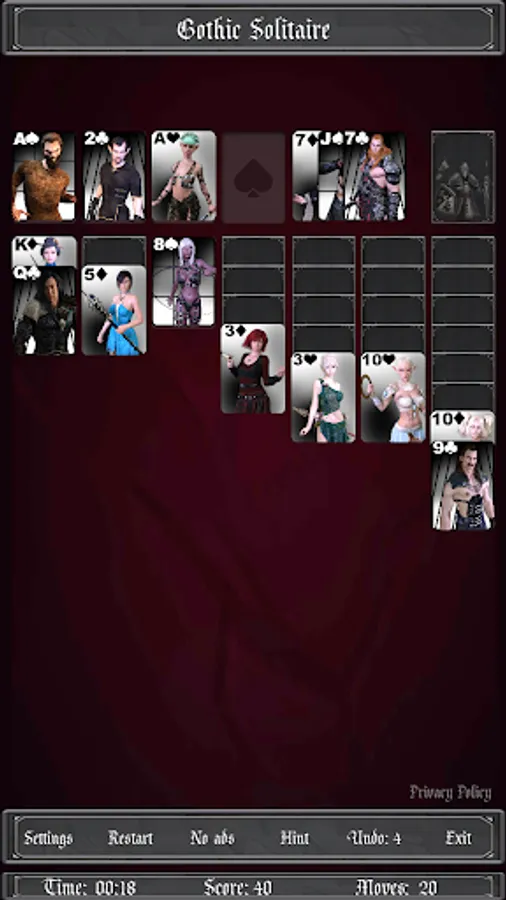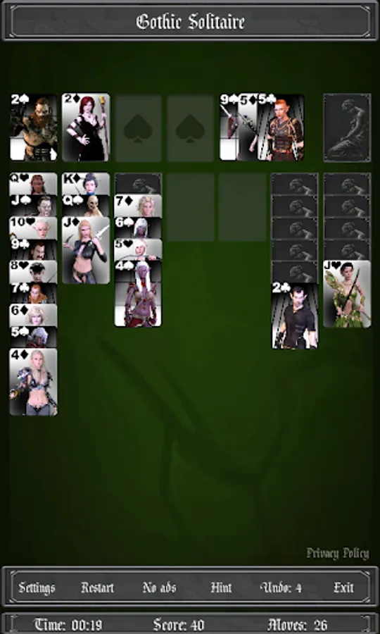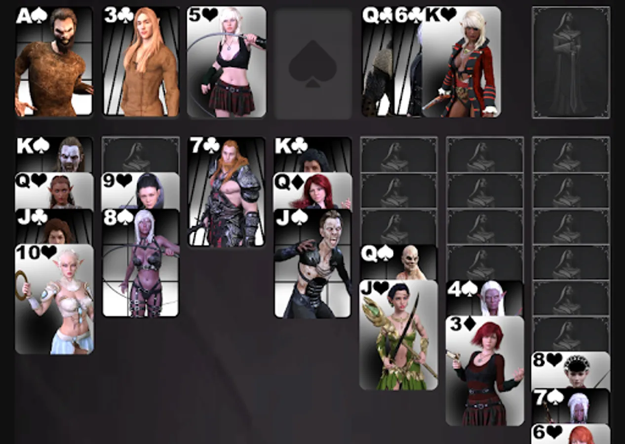 Characters on the cards are themed as follows: hearts are elven females, diamonds human females, clubs are male fantasy characters, and spades are undeads and drows. The cards are very detailed, so the game might be best played on a high-resolution tablet.