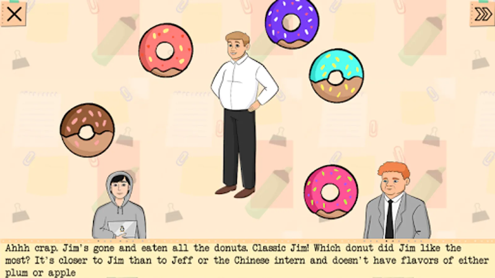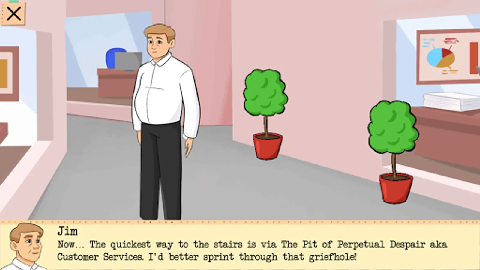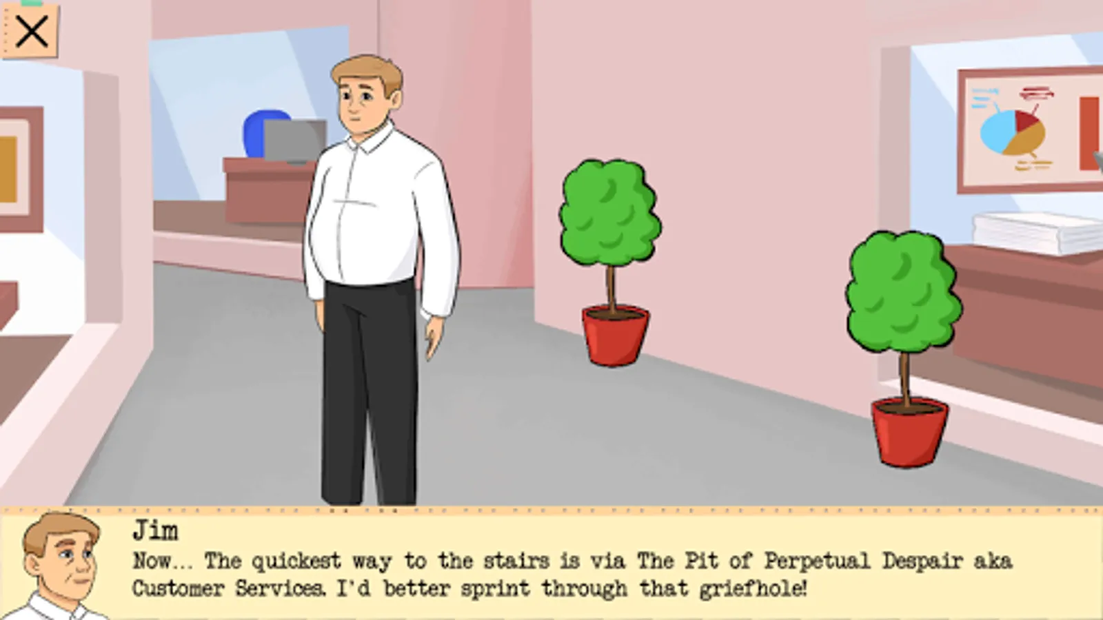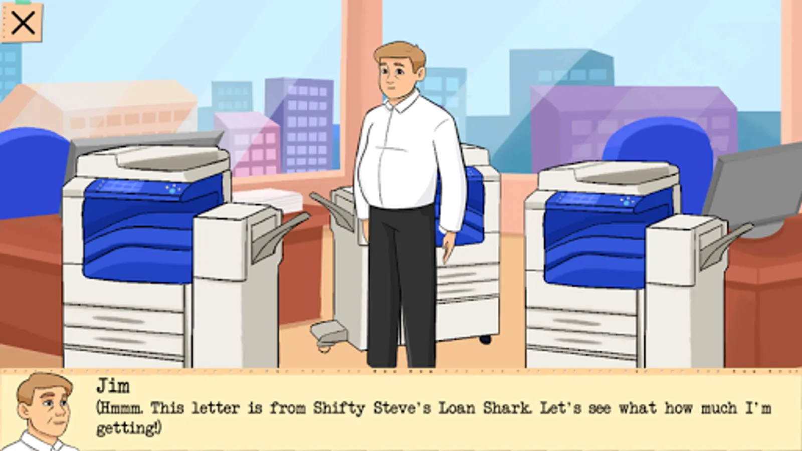 The story will have 5 chapters. In this Early Access version we publish only the 1st chapter where Jim is finding his way out of the office building. If you like the game, please let us know in a review or just drop an email to gamesforgirslou@gmail.com. Before going on with implementation of the rest of the chapters we'd happy to get some feedback. Humorous stories are rare on Google Play, and it's hard to say what stuff adult players would actually like, hence this iterative approach.