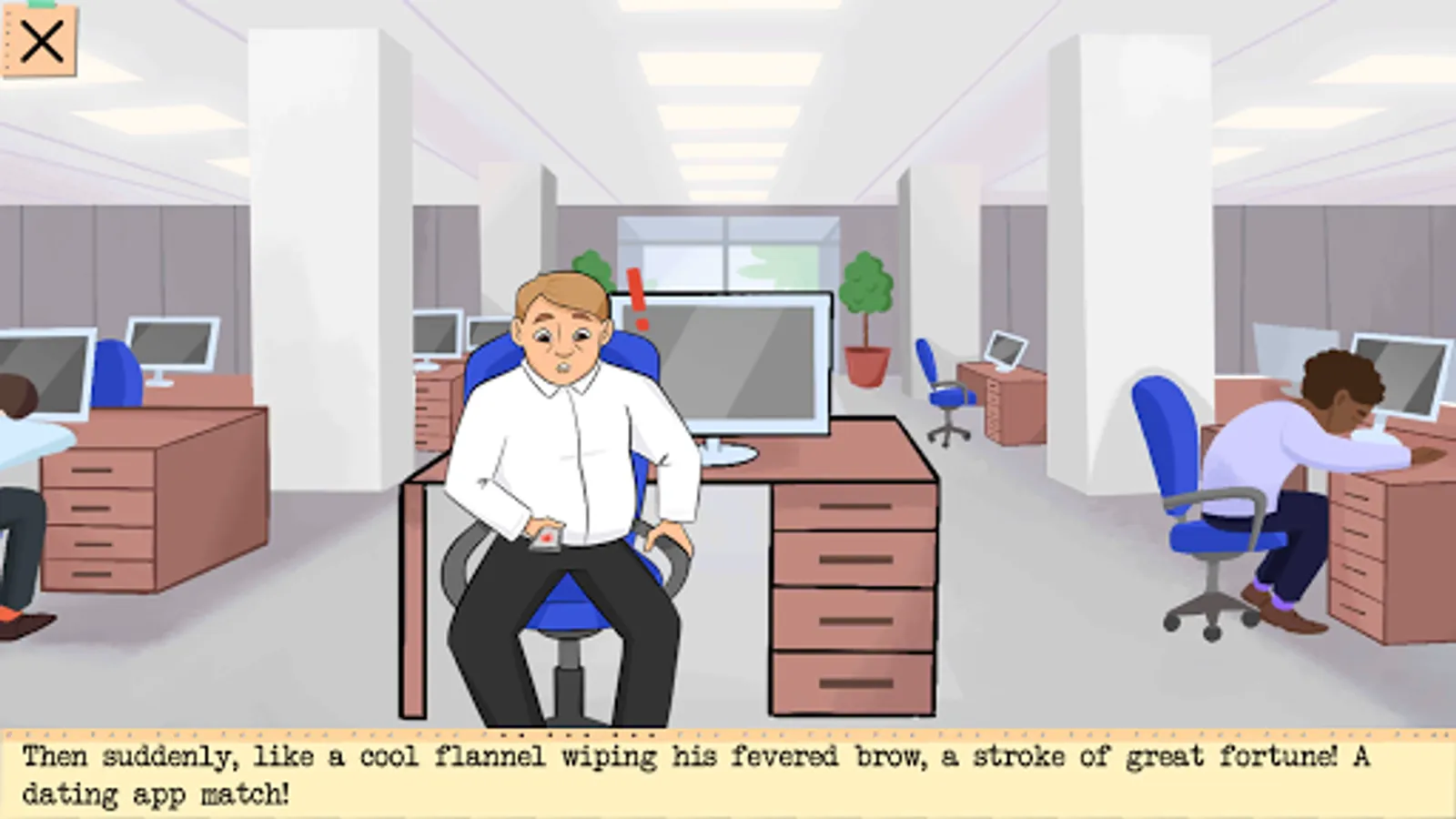 This is a funny kinetic visual novel with minigames where an insurance agent named Jim is sneaking out of the office to meet a girl his dating app matched for him.