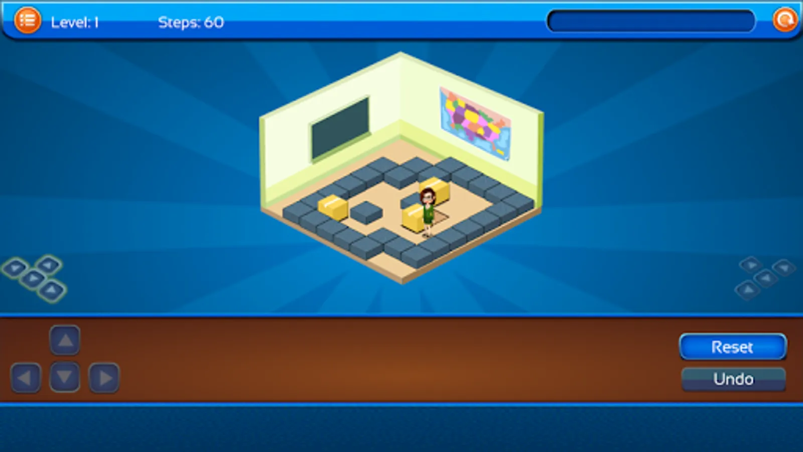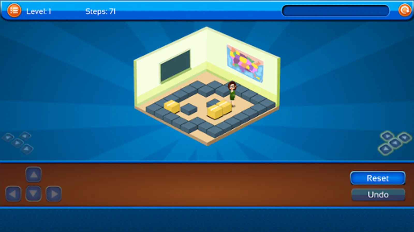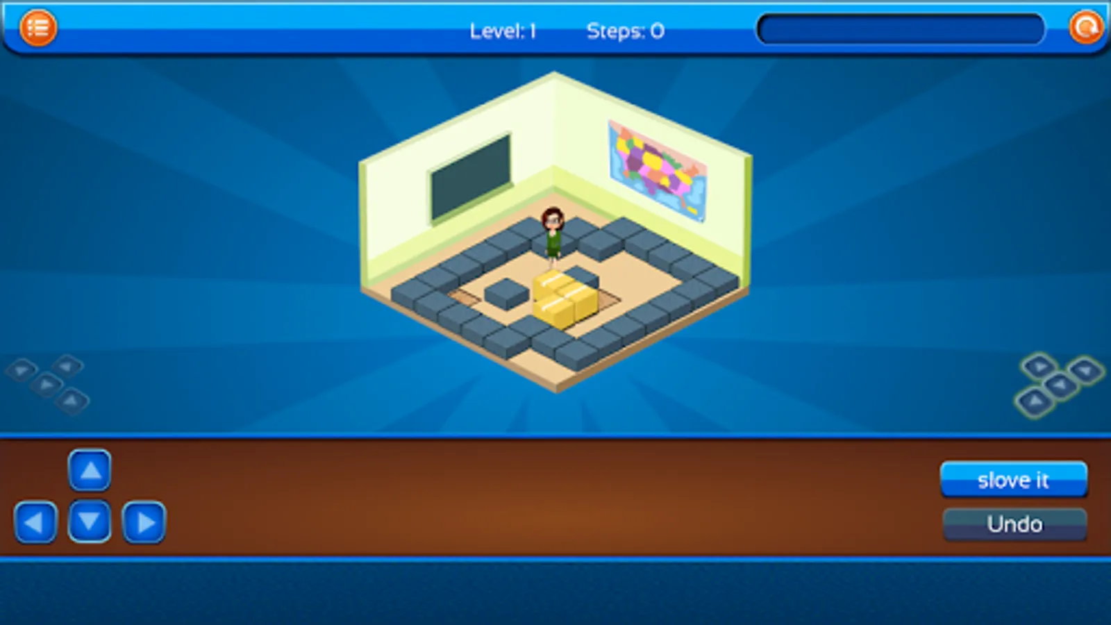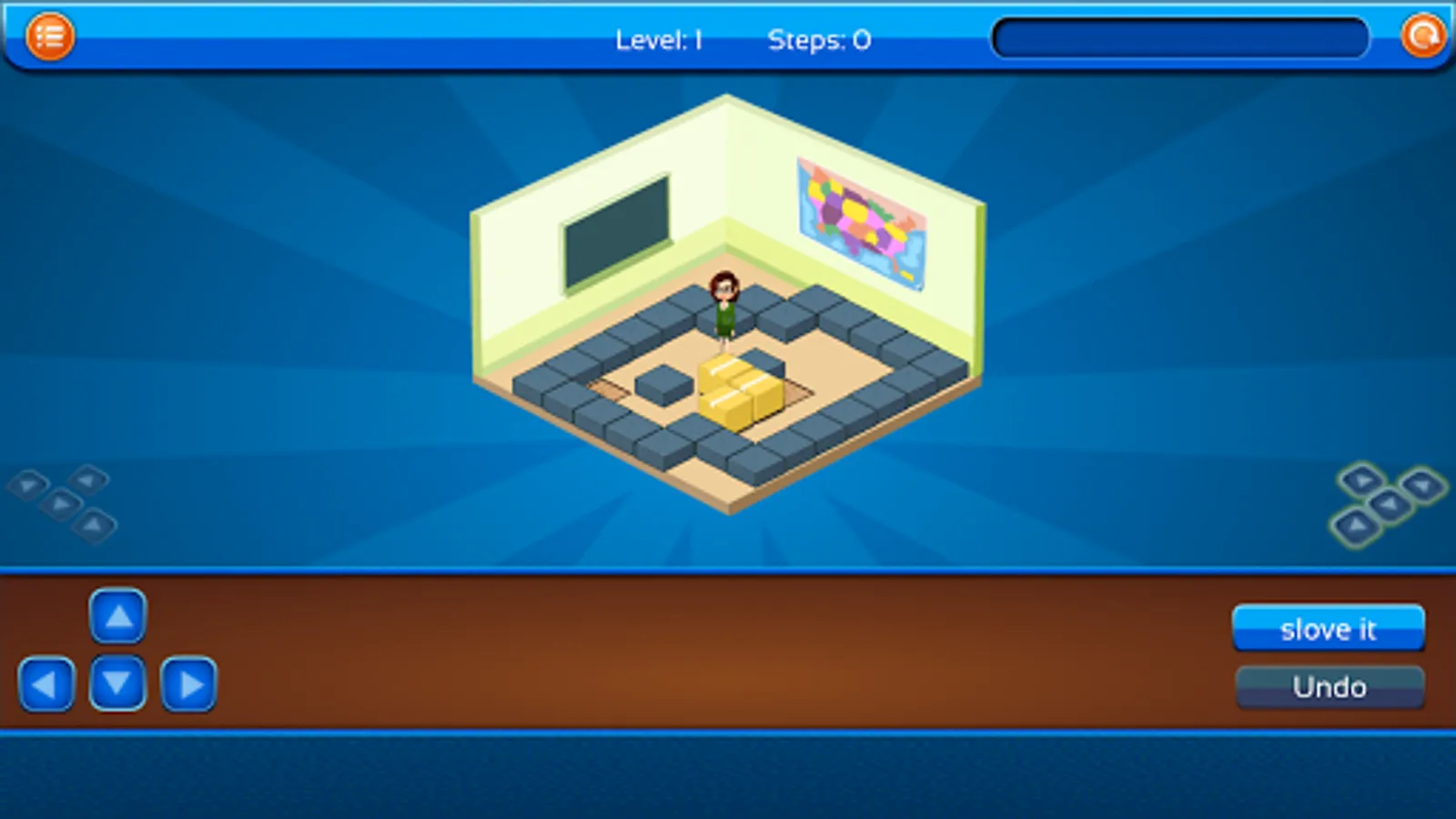 This is a puzzle game where you need to move the teacher around the classroom, push boxes and eventually get all the boxes to the correct spots. The difficulty is that you can't pull the boxes, only push.