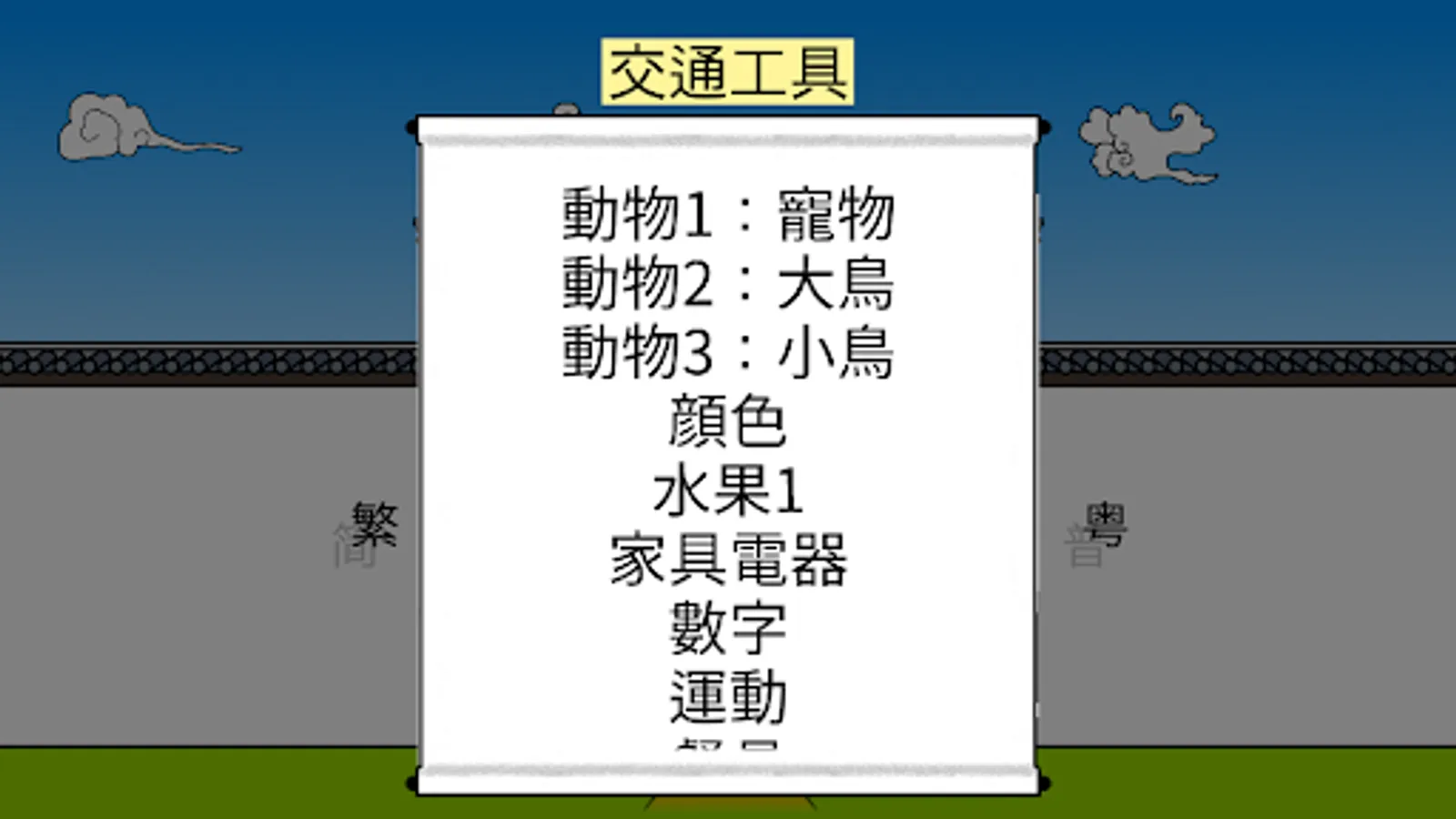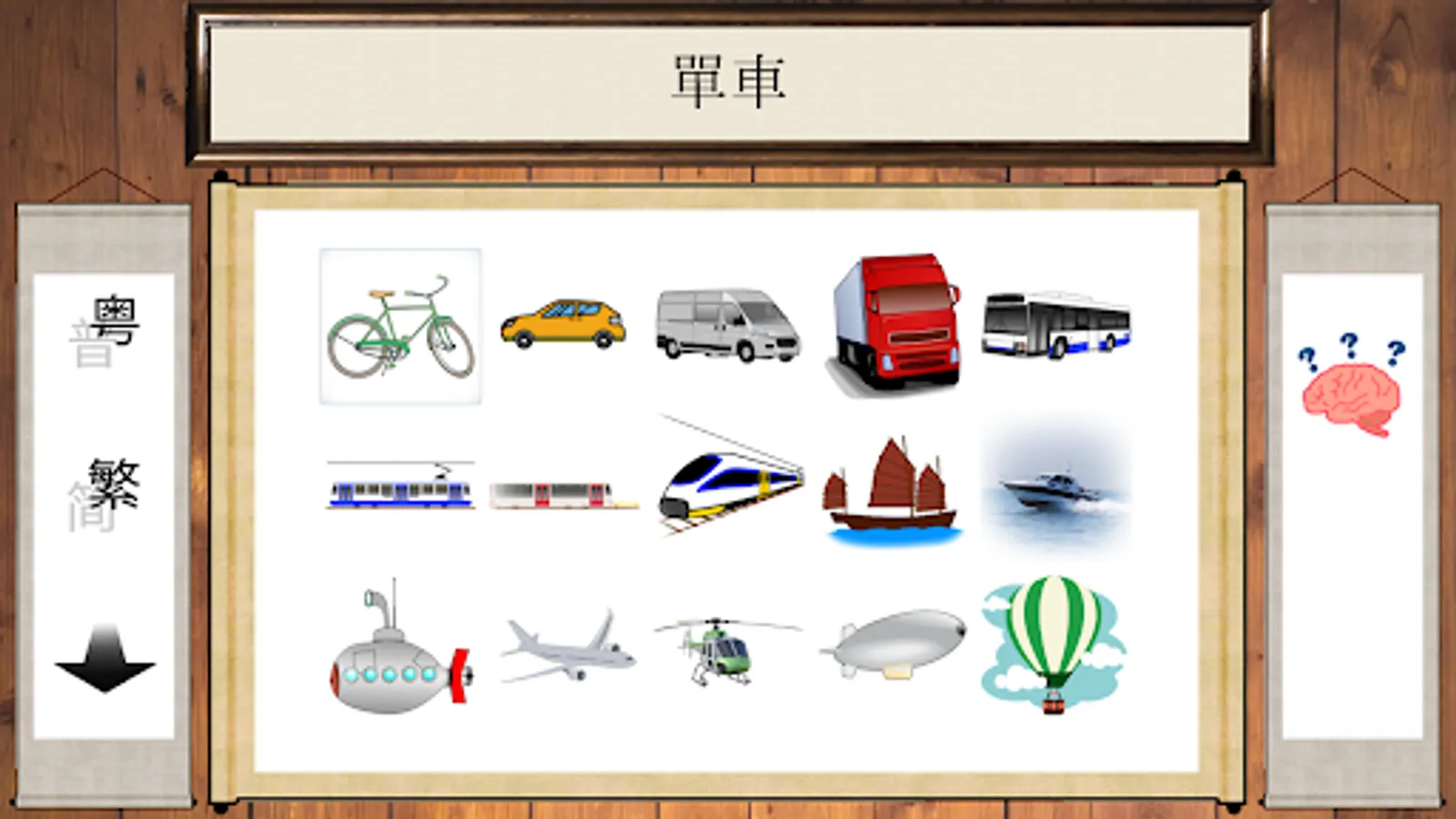 每個主題帶有生動的圖畫,點擊圖畫後會顯示詞語的文字,播出詞語的讀音。