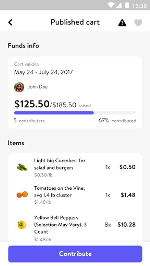 Now, the GForward app does all the work, locating your local participating grocer closest to your zip code. Your grocery list is then generated and ready for contributors to review and contribute payment for some or all of the grocery items.