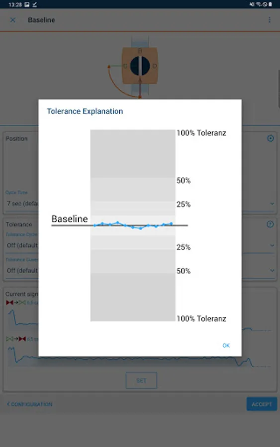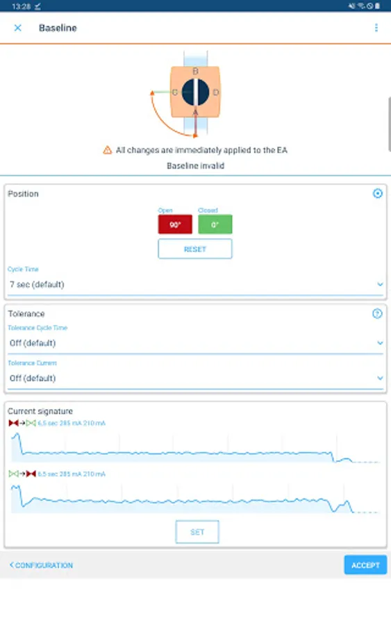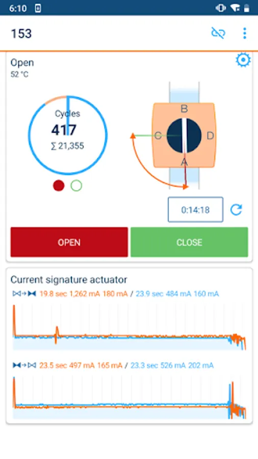 Initial motor current: After the first install, the app records the very first motor current curve as a baseline for historical comparisons to derive health status of the valve assembly