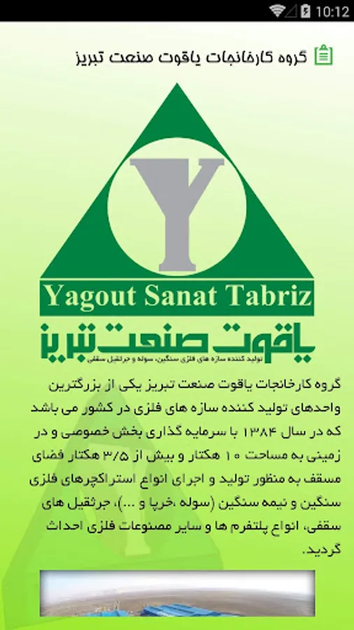 Group plants sapphire industry Tabriz (YAGOUT SANAT TABRIZ FACTORIES GROUP) is one of the largest manufacturer of steel structures in the country with private-sector investment and a land area of 10 hectares with more than 5/3 hectare of indoor space to produce and execution of steel structures, heavy-duty and heavy-duty (niches, truss, etc.), overhead cranes, various platforms and other metal products has been constructed. The company is a subsidiary of investment Tabriz steel expansion depends on an investment holding company that plays an important role in accelerating the development of factories and industrial complexes is an investment.