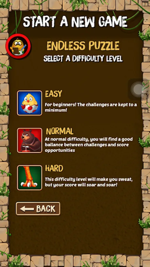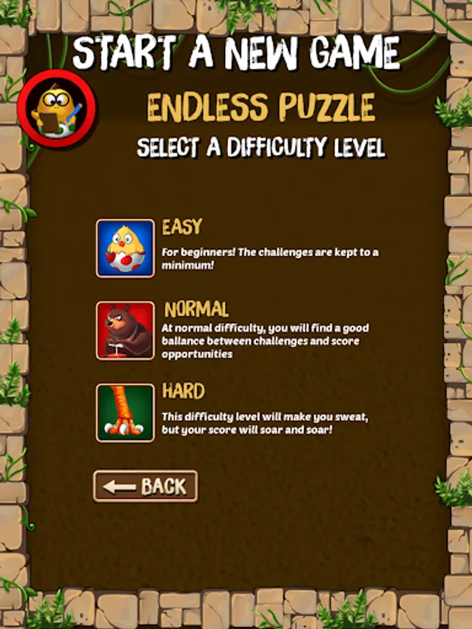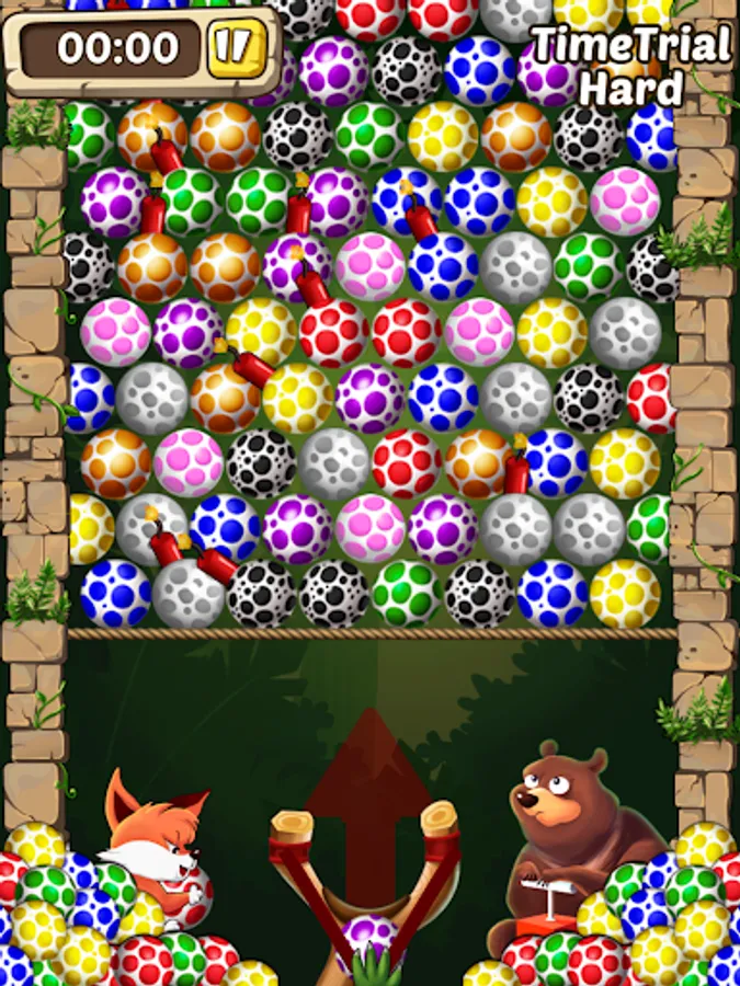A puzzle arrangement appears on the screen. The goal is to clear the arrangement by shooting matching eggs of the corresponding colour next to it. However, every egg the player shoots will increase Mama Ostrich's anger meter. Every time the meter gets full, Mama Ostrich pushes the puzzle down one notch with her foot, making the board more difficult to accomplish.
