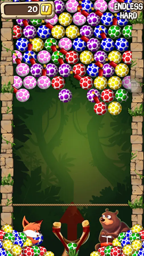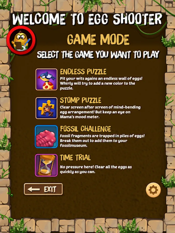 A piece of a dinosaur fossil is surrounded by eggs, and the player must shoot matching eggs to break the piece free and add it to a collection of completed fossils. There are 15 fossils, each having three fragments, for a total of 45 levels in this mode. Like Endless Puzzle, if the eggs and fossil piece reach the bottom of the screen, Mama Ostrich will crush the screen and the game is over.