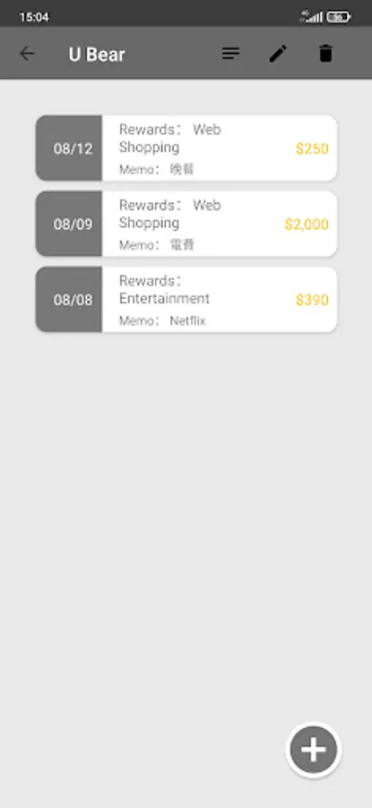 For the first use, please click the + button in the lower right corner to add a credit card, and then click the credit card to add a new consumption record.