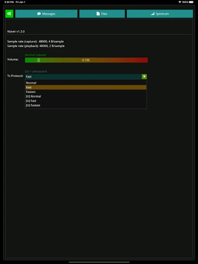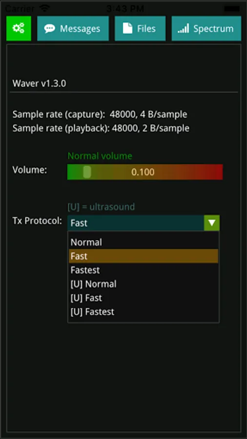 - In the settings menu, you can adjust the volume and the transmission protocol that will be used when sending messages. Make sure to adjust the volume level high enough, so the sounds can be picked up by other devices