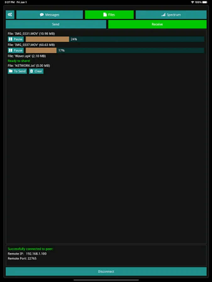 - The files are transmitted over TCP/IP. The sound message is used only to initiate the network connections between the devices
