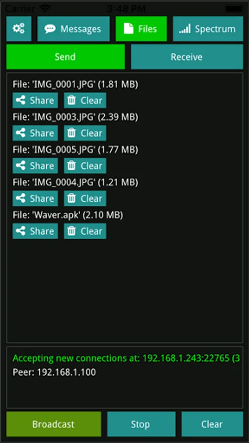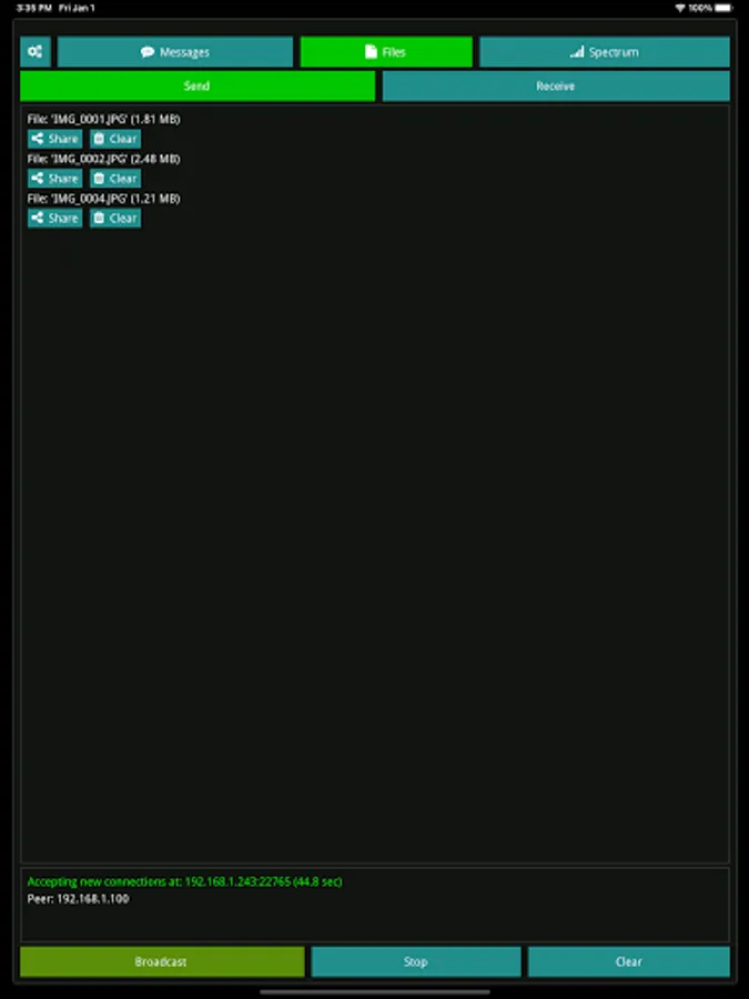 - In the "Files" menu, click on "Broadcast". This plays an audio message that contains a file broadcast offer