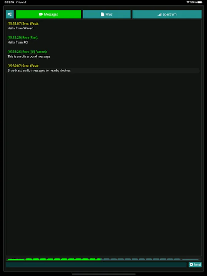 - Any nearby device that is also running this application can capture the emitted sound and display the received message