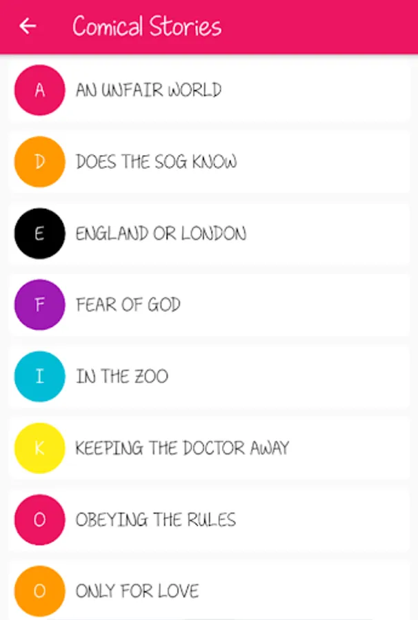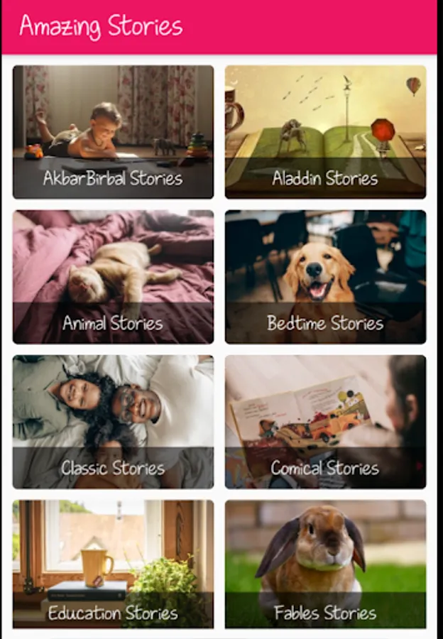 The 100000 English Stories app contains various stories categories like humor, comedy, ancient stories, folktales stories, Moral Stories, Tenali Raman, Akbar Birbal Stories, Aladdin (Magic Lamp), The Arabian Nights, Inspirational Stories, Bedtime Stories, Motivational stories Comical Stories, Educational Stories, Fables Stories, Diligence Stories, Family Stories, Mullah Nasruddin Stories, Life Stories, Love Stories, Animal Stories, Panchatantra Stories, Short Stories, Courage Stories, General Stories, Classic Stories, Other Stories.
