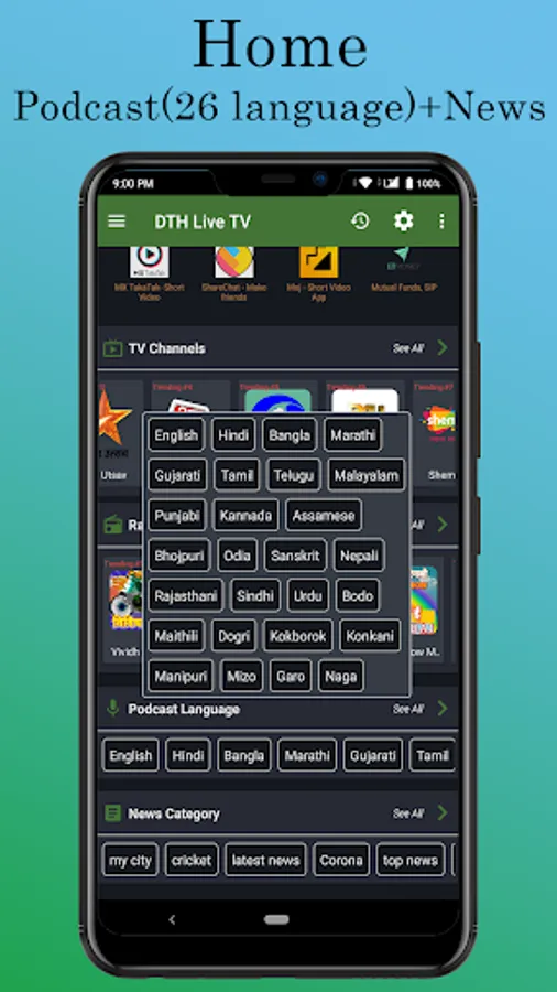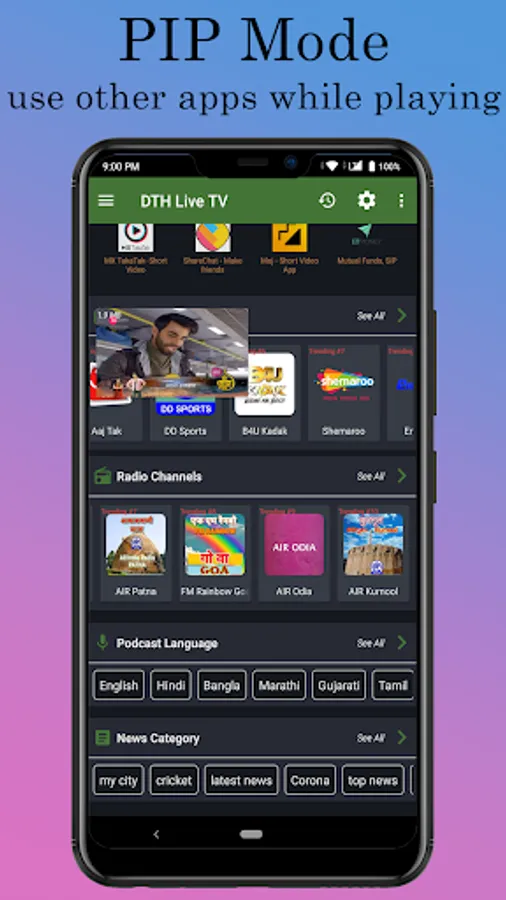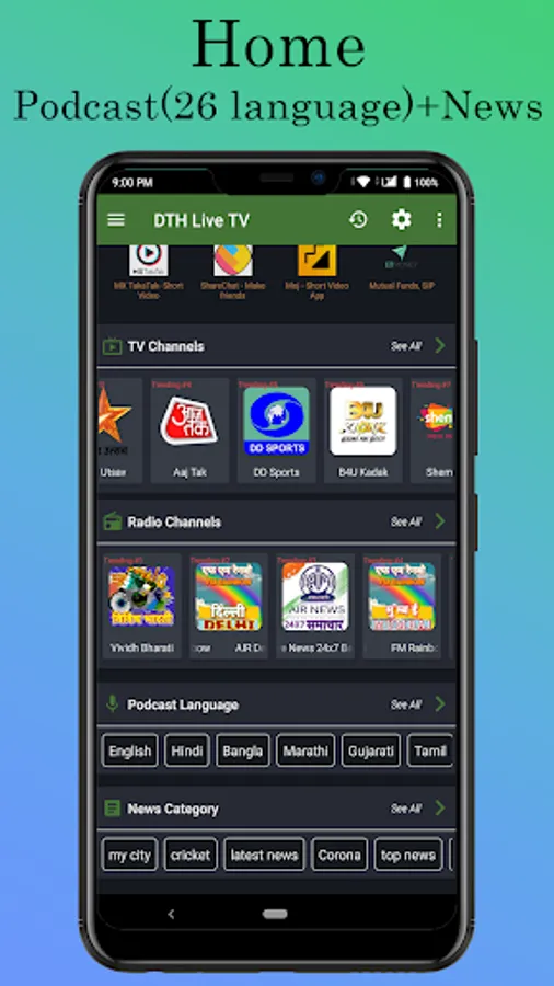Watch live tv any time anywhere absolutely free, we created this app for your entertainment, all in one pack for entertainment. Latest TV channels, huge number of radio channels, news in different language, games for game lovers, podcast for news updates in 26 different Indian language. Sports scores and live cricket at your fingertips. Just install the app and enjoy live programmes with advance full tv schedule also you can set reminder to get a notification when you want to watch a particular program.