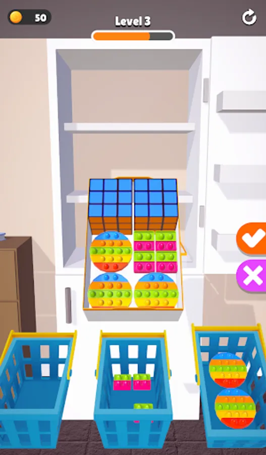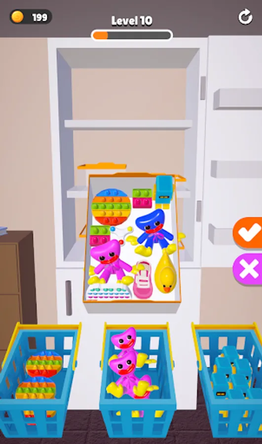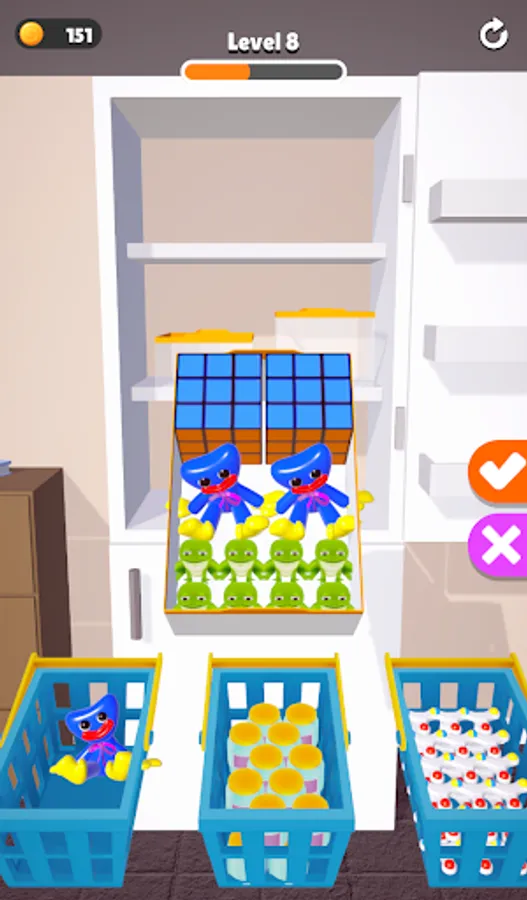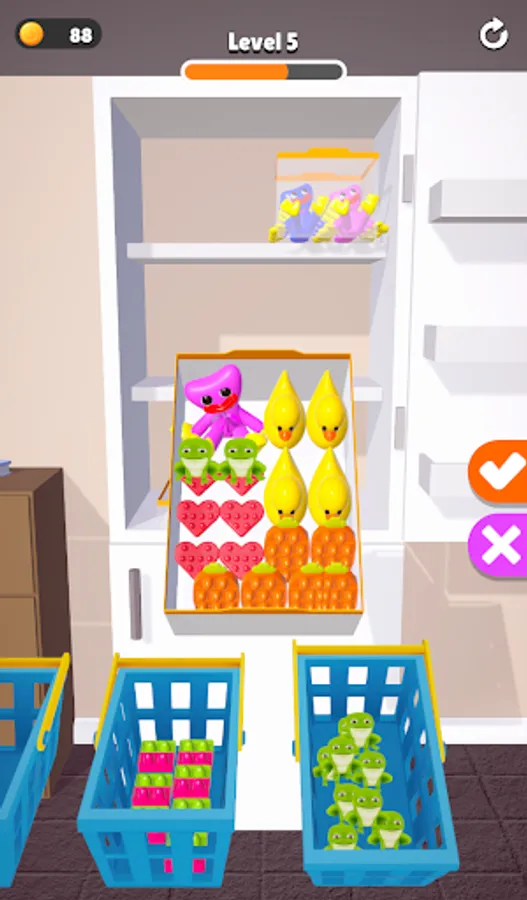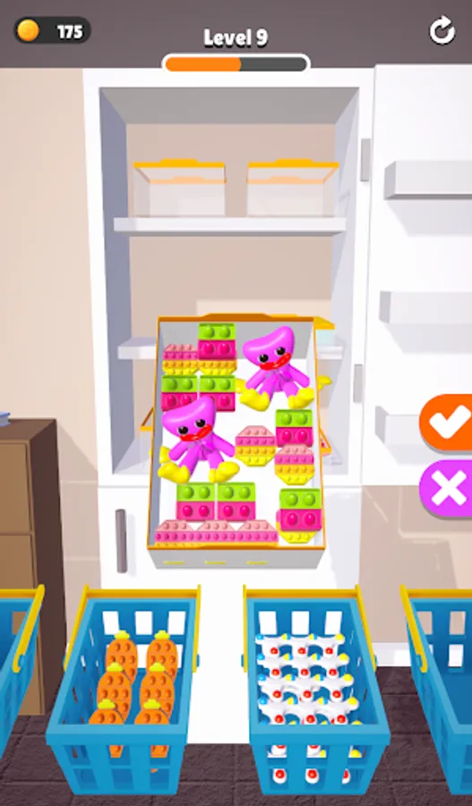 Now that you have a lot of toys, are you ready to fill the fridge? Amazing! Start filling using different objects, toys and many more items in fridge shelves and try to fit them all. Empty your shopping baskets one by one, find perfect spots to sort and fridge restock to play however you like!