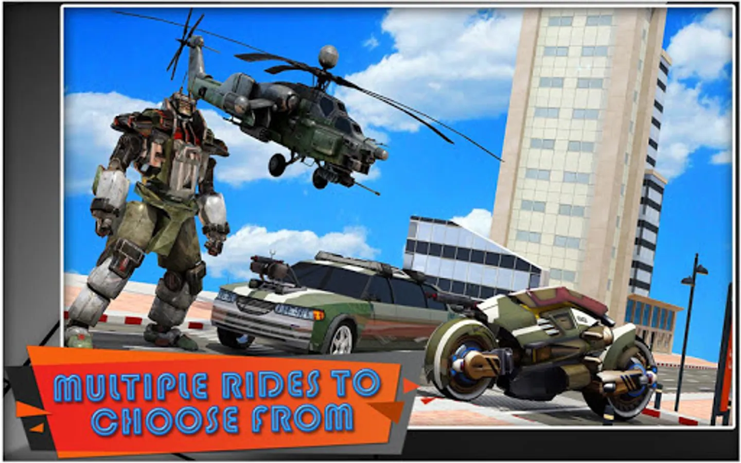Are you a robot games enthusiast? We bring a striking introduction to robot transforming games offering you an exquisite range of vehicles to drive for an exhilarating experience. Our game unleashes an unprecedented combination of multiple rides in this brilliant concept. Move around the city as a super robot which has splendid capability to disguise into variety of automobiles; transform into state of the art motorbike, change into an elegant limousine car or fly a spectacular helicopter. Feel like a pro, show diversity of riding various machines with authority and convert at the right moment to show fire power to enemies as this game masterfully unfolds flavor of robot fighting games. Use punches, kicks and shoot at your opponents to completely destroy them. You can have the luxury to get back to your original state anytime and again has adaptability to change into another vehicle of your choice in this futuristic concept. If you love transforming games then this game is for you, download now for a life time entertainment experience.
