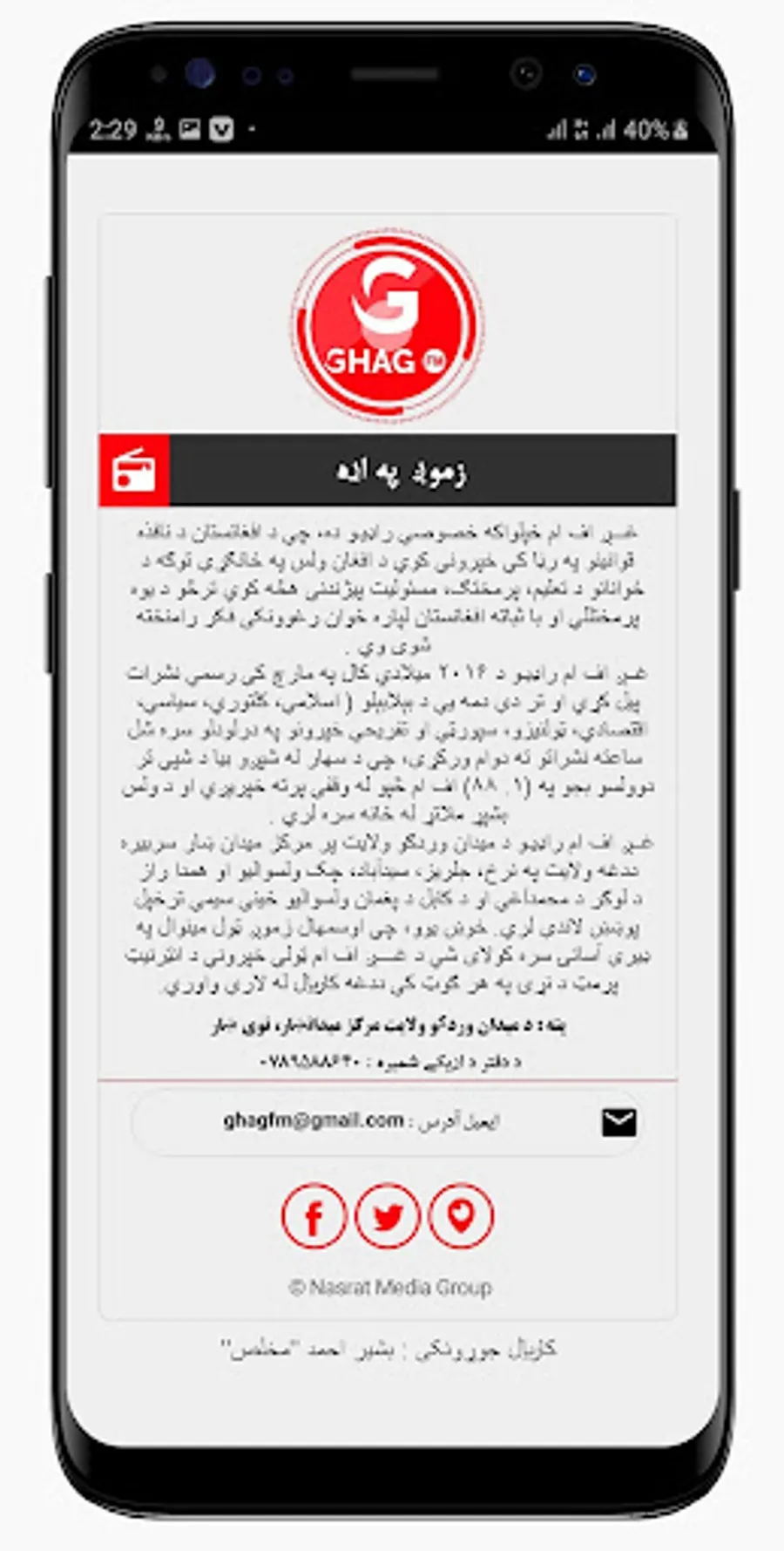 غــــږ اف ام يوه خپلواکه خصوصي راډيو ده، چې د ميدان وردګو ولايت په مرکز میدانښار کې د افغانستان د رسنيو قانون په چوکاټ کې خپرونې کوي او د افغان ولس په ځانګړې توګه د ځوانانو لپاره د داسې انګيزو د رامنځته کولو هڅه کوي، چې د دوئ ترمنځ رغنده نوښتونه رامنځته شي.