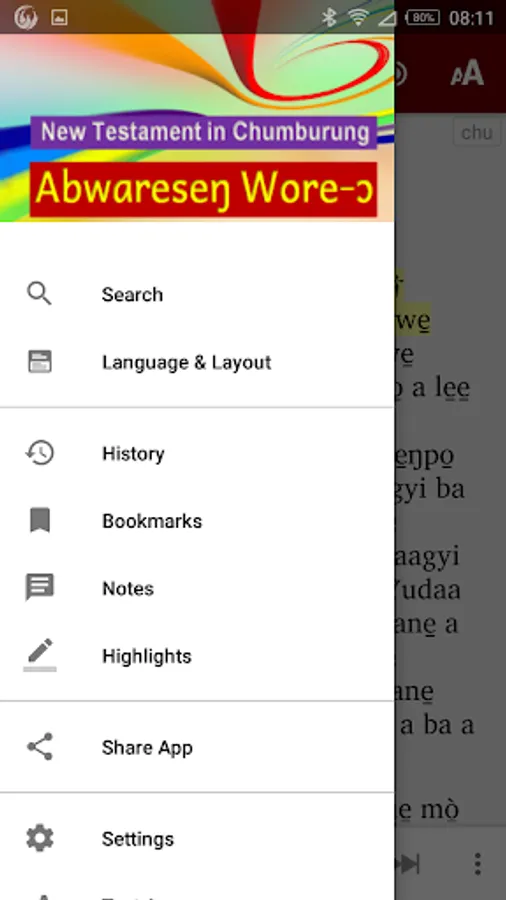 Or else, click on the small loudspeaker icon on the top right side of your screen. Just give permission to the Chumburung app to download the audio files from the Internet, thus you can read and hear the highlighted yellow text on your smartphone screen. All the files once downloaded will stay on your device.