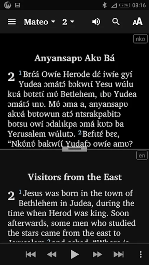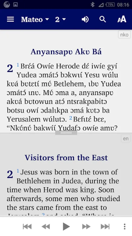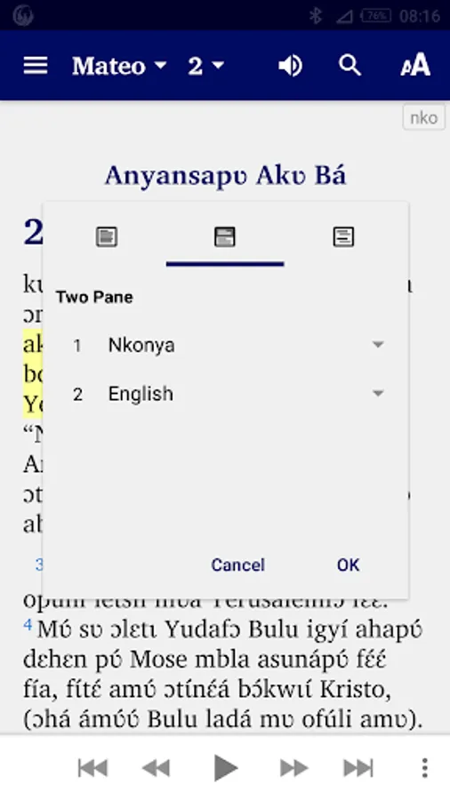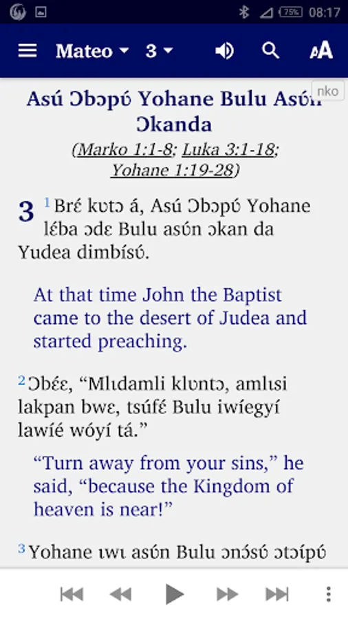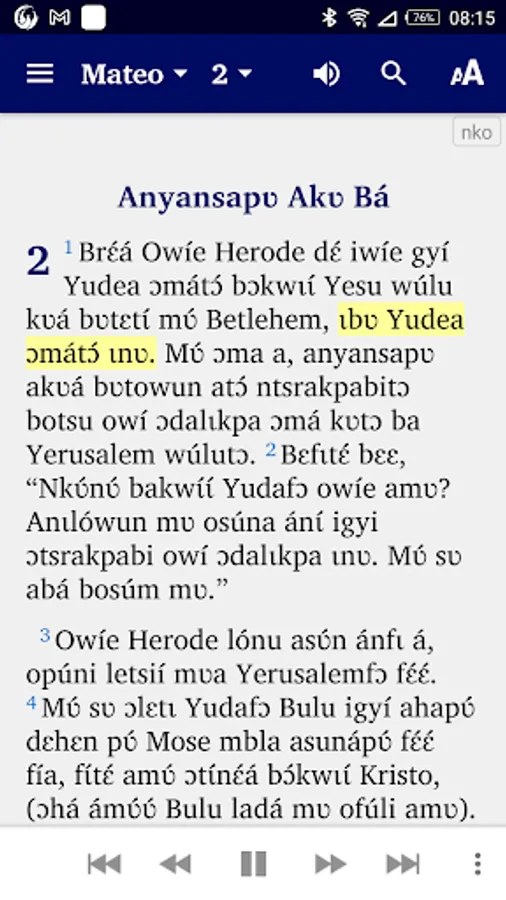 Or else, click on the small loudspeaker icon on the top right side of your screen. Just give permission to the Nkonya app to download the audio files from the Internet, thus you can read and hear the highlighted yellow text on your smartphone screen. All the files once downloaded will stay on your device.
