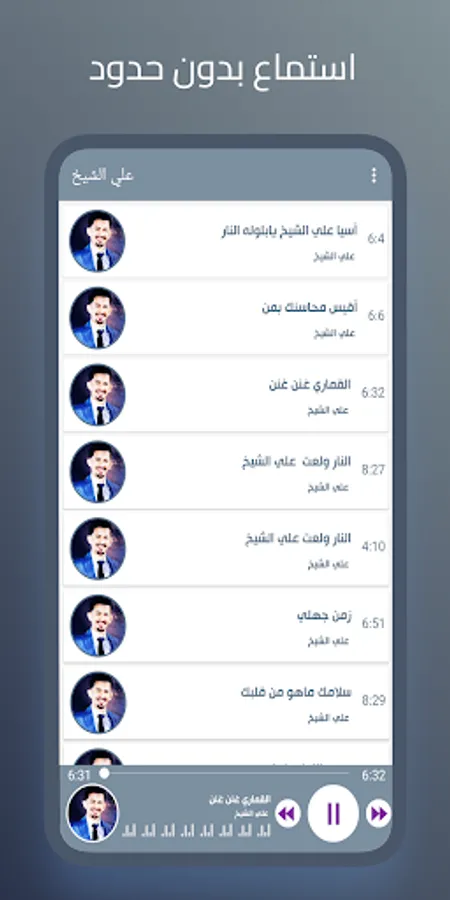 هذا تطبيق يضم روائع علي الشيخ بجودة عالية وبدون الحاجة للاتصال بالانترنت. واذا كنت من محبي الاستماع الى اغاني علي الشيخ الطويلة بدون انترنت بالعربية فان تطبيق اغاني علي الشيخ بدون نت سيتيح لك الاستماع لمزيج من التقاليد واصالة الفنان علي الشيخ بدون انترنت. كل اغاني علي الشيخ ستجدها بدون انترنت في تطبيق دو بتصميم انيق وسهل الاستخدام وسريع وممتع.