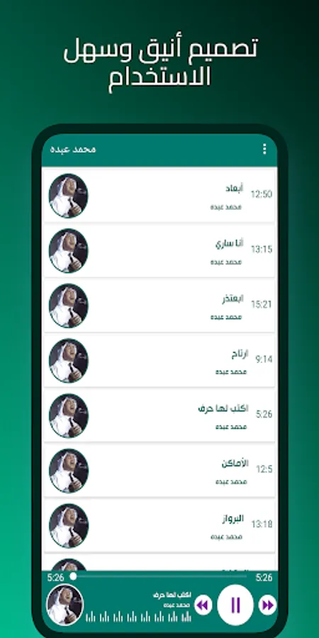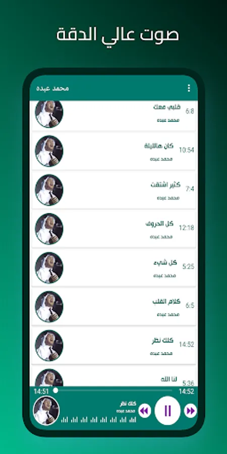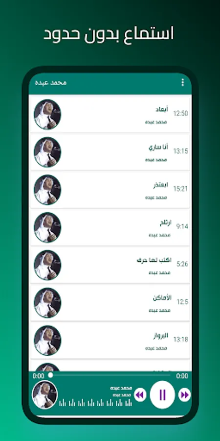 هذا تطبيق يضم روائع محمد عبده بجودة عالية وبدون الحاجة للاتصال بالانترنت. واذا كنت من محبي الاستماع الى اغاني محمد عبده الطويلة بدون انترنت بالعربية فان تطبيق اغاني محمد عبده بدون نت سيتيح لك الاستماع لمزيج من التقاليد واصالة الفنان محمد عبده بدون انترنت. كل اغاني محمد عبده ستجدها بدون انترنت في تطبيق دو بتصميم انيق وسهل الاستخدام وسريع وممتع.