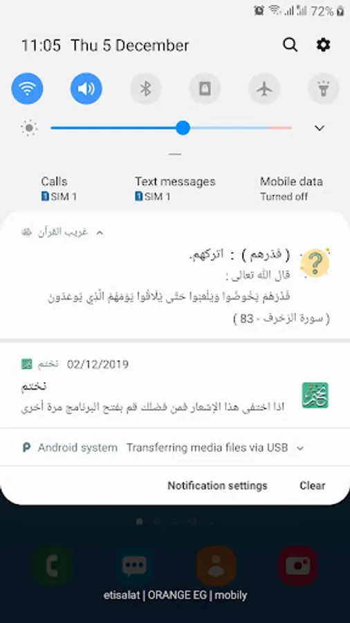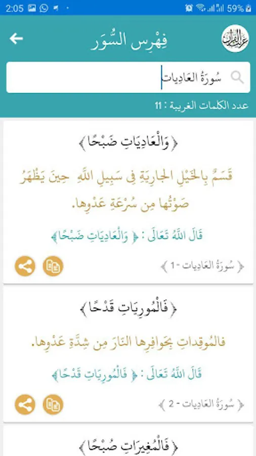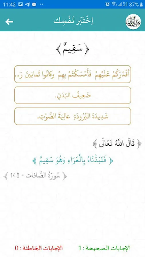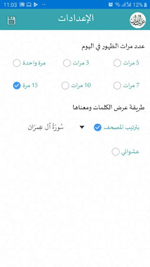 6- You can choose between displaying the meanings of the words randomly, or by arranging the Qur’an according to the surah you want