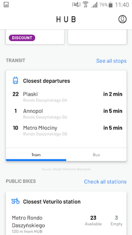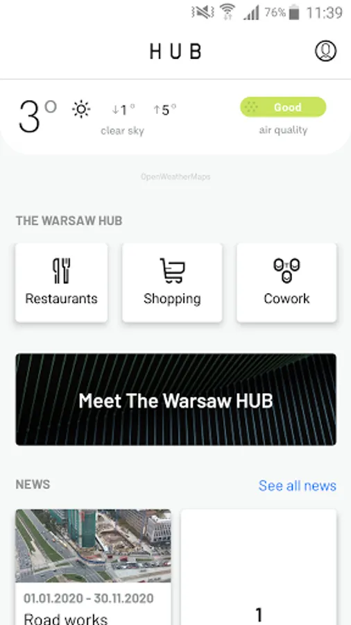 The Warsaw HUB is one of the most technologically advanced buildings in Poland. To facilitate a smooth-running business environment, The Warsaw HUB incorporates a range of sophisticated technologies. One of them is Warsaw HUB mobile app that connects tenants with the building and the city. First version of the app serves information about: weather, smog, public transport and bikes.