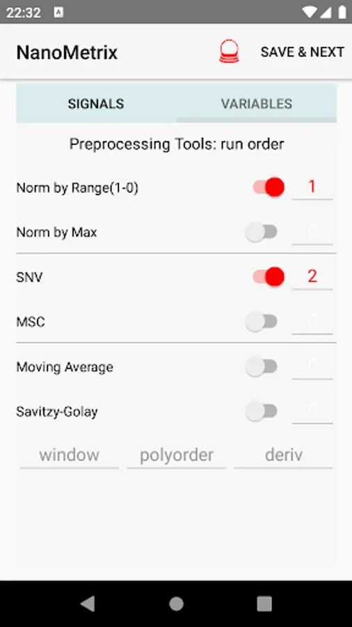 -Data Pretreatment: Normalization by Range(1-0), SNV, MSC, Mov. Average, Savitzky-Golay