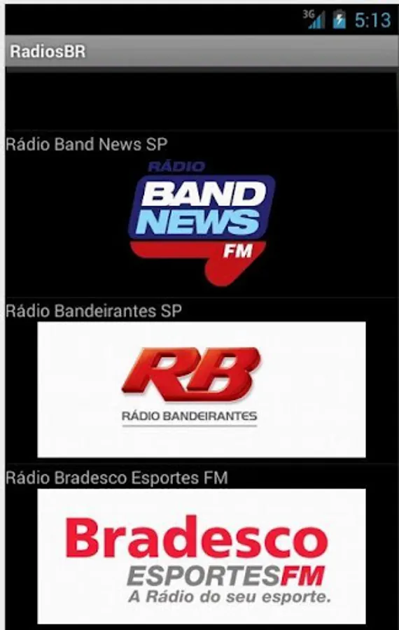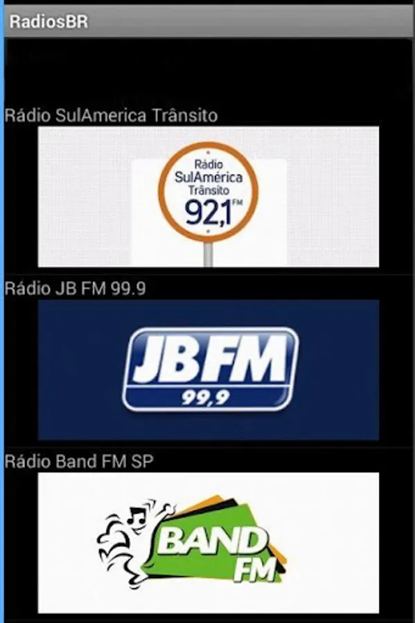 Broadcast radios in Brazil: Alpha FM Radio, 89 Rock Radio, Kiss FM Radio SP, Live T net Radio, Transamerica SP Radio, Transamerica PR Radio, Energia 97 FM Radio, Saudade FM Radio, SulAmerica Transit Radio, SulAmerica Paradiso Radio , Radio JB FM 99.9, Radio Mix FM RJ, Radio Mix FM SP, Radio Band FM SP, Radio Bandeirantes SP, Radio Bandnews FM SP, Radio BandNews FM RJ, Radio BandNews FM BH, Radio BandNews FM Salvador, Radio BandNews FM Brasília, BandNews FM POA Radio, Bradesco Sports FM SP and RJ Radio, Native SP Radio, RJ MPB Radio, Pan AM Youth Radio, Pan FM Young Radio, Pan FM Young Radio, ESP 107 Hot Radio, Transcontinental Radio, Iguatemi Radio SP 1370 AM, Radio Brazil SP 690 AM, Radio Tupi SP 1150 AM, Super Radio Tupi RJ 1280 AM, Radio Globo SP 1100 AM, Radio Globo SP 1100 AM # 2, Radio Globo RJ 1220 AM, Radio Globo MG 1150 AM, Radio CBN SP 780 AM, CBN RJ 860 AM Radio, Beat98 FM Radio, BH FM 102 Radio, Radio Manchete 760 AM, Radio Inconfidência 880 AM, Radio CDL 102.9 FM, Radio Itatiaia, Radio Itatiaia Juiz de Fora, Radio Itatiaia Sul de Minas, Radio 98 FM BH, Radio Gaúcha POA, Radio Clube 101.5 FM Curitiba, Radio Clube Ceará, Radio Green Olive 98.7 FM, Jangadeiro Radio 88.9 FM, Resistance Radio 93.7 FM, Marine Radio 100.1 FM, Radio 95 FM, Satellite Radio 87.9 FM, Radio BackStage, Radio Culture, Radio Culture Brazil, Record Radio, Towner FM 107.1.