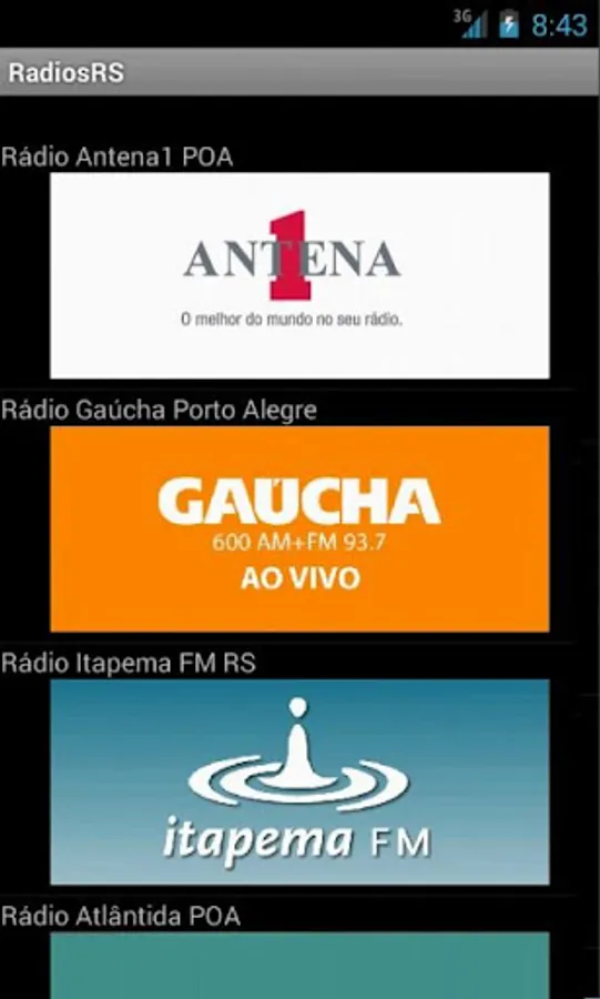 Large audience radios in Rio Grande do Sul - Brazil: Rádio Gaúcha Porto Alegre, Itapema FM RS, Atlântida POA, Cidade FM, Guaiba POA, GRENAL, Pampa AM, Jovem Pan, 104 FM, Continental, Eldorado, Liberdade, Praia FM, Princesa, Capão FM, Band AM 640, Ipanema FM 94.9, Pelotas University, Germânia FM, Imperial FM, Rádio da UFRGS, União Novo Hamburgo, União Pelotas, FM Broadcast, AM Broadcast, Arauto FM, Pop Rock Cruz Alta, 88.7 FM, Nativa Santa Maria, Gazeta FM, Pop Rock Bagé, Rádio Oi 92.5 FM, Rádio Lider FM, Rede Mais Nova FM, Rádio Jacui FM, Sobradinho AM, Tupanci 1250 AM.