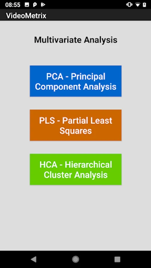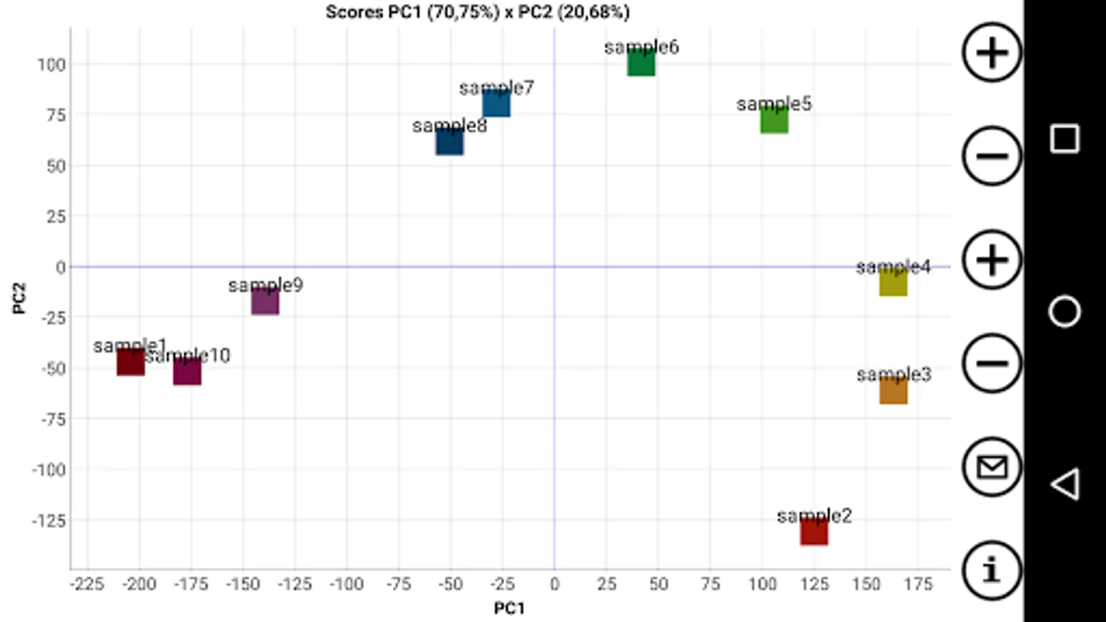 Based on PhotoMetrix, this app employs Single Linear Correlation technics for univariate analysis, Principal Component Analysis (PCA) and HCA for multivariate exploratory analysis and Partial Least Squares (PLS) form multivariate analysis. The image data are acquired using the device main camera and converted in RGB histograms. In addition, apart color channels of RGB, HSV, HSL and HSI systems are used during the univariate and multivariate processes. It is possible to send by e-mail the image data, analysis data and charts. In order to validate the obtained results, the same sets of data were tested using Microsoft Excel© and ChemoStat©. The results in both applications coincided in various combinations.