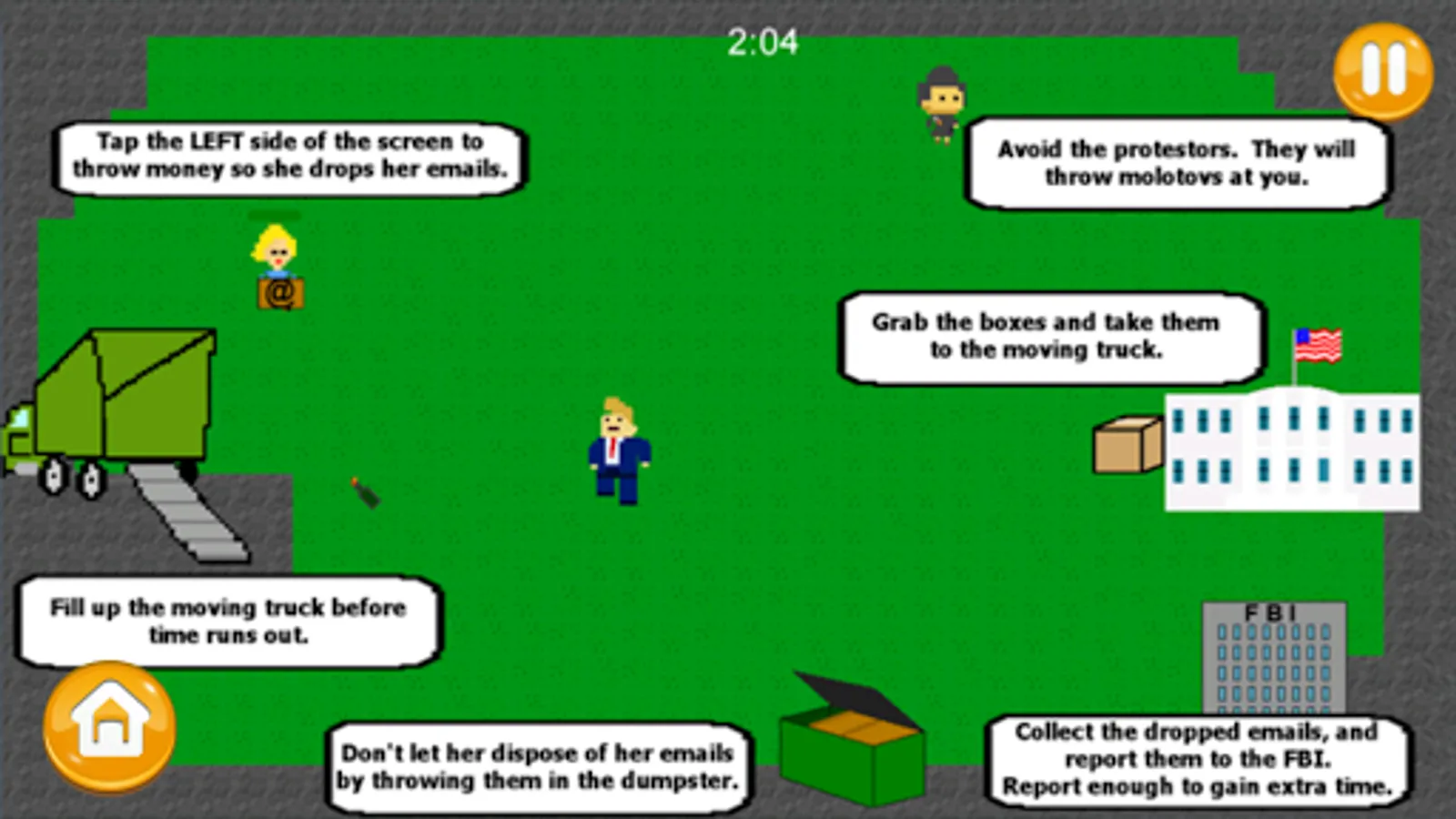 You are the president elect and the former president needs help to get his belongings to the moving truck. It isn't so simple, protesters are attacking you, and someone is trying to trash their emails so you need to stop them by throwing money at them. You then can report the emails to the FBI.