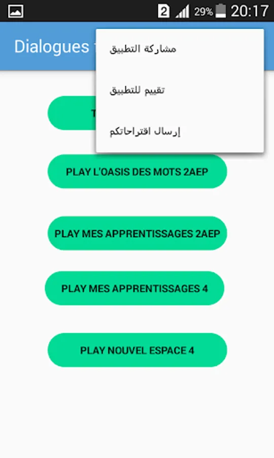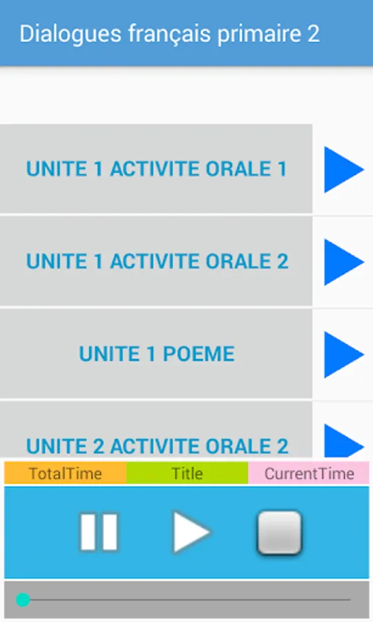 The application presents dialogues in the form of written texts to facilitate memorization, Strengthening the reading skills of students and also audio tracks which are used as teaching aids for the lessons of oral activities.