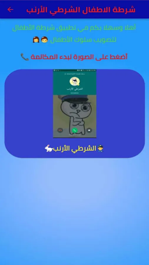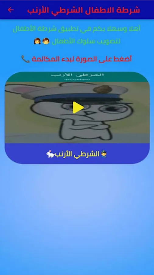 This application is a fake call with the policeman rabbit and is designed for parents to correct the behavior of children, through which you can pretend that you are talking with the policeman, the rabbit pretends to be a policeman who uses the call to reinforce the child and correct his behavior.