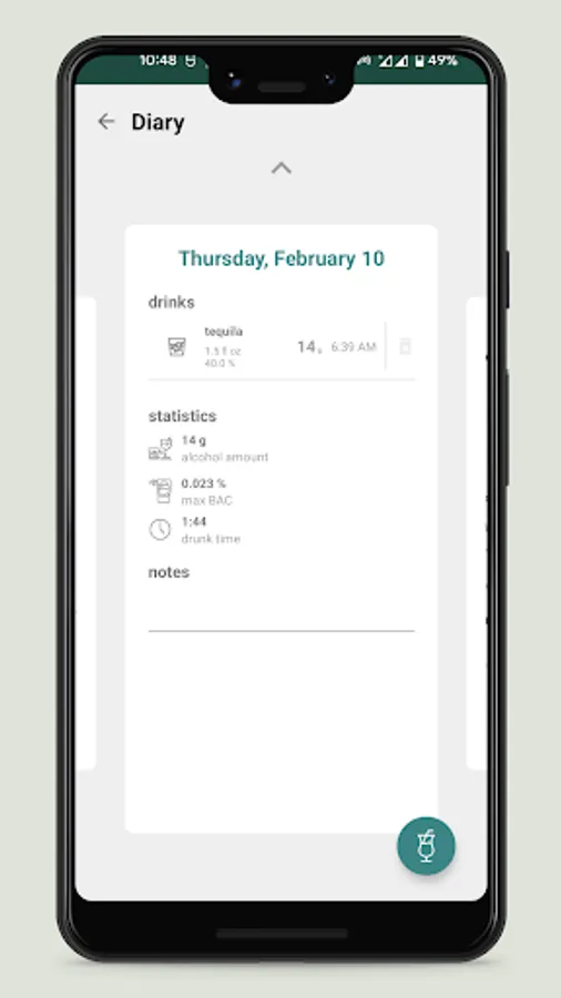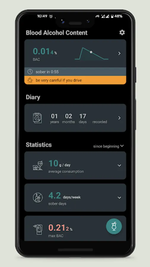 AlcoDiary allows you to calculate your blood alcohol content (BAC) in real time based on your consumption and your physical characteristics (gender, age, weight...).