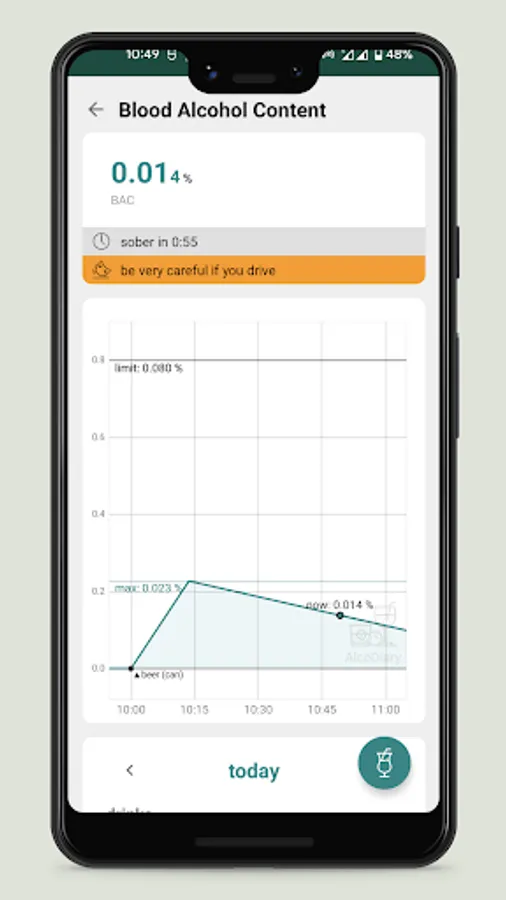 The blood alcohol content (BAC) calculator allows you to determine your current and future BAC. Taking into account personal and physical characteristics such as gender, age or weight allows for an accurate BAC calculation. All you have to do is add alcoholic beverages consumed at the present time or in the past. The application provides a list of predefined drinks (beer, wine, cocktails...) but also allows you to create your own drinks (volume, alcohol percentage).