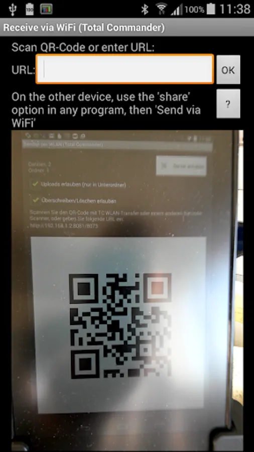 Note: Both devices need to be in the same WiFi network. If the sender isn't part of a WiFi network, this tool will offer to create its own access point, or start a WiFi direct connection. Other devices can then connect to this network to transfer data. If you scan the QR-Code from a copy of the WiFi plugin, the connection will be established automatically, and closed automatically when disconnecting.