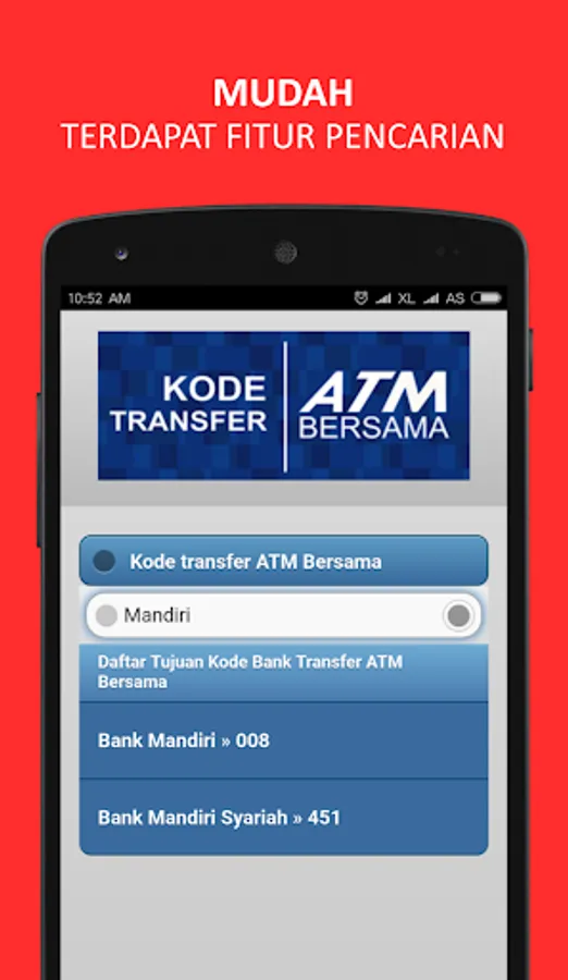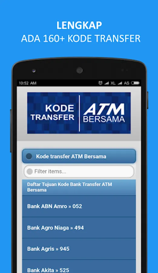 This application contains a list of bank codes incorporated in the ATM Bersama network owned Artajasa. The bank code required to perform financial transactions across different banks. One such transactions are transfers between accounts of different banks, which require the destination bank code when making transfers at ATMs.